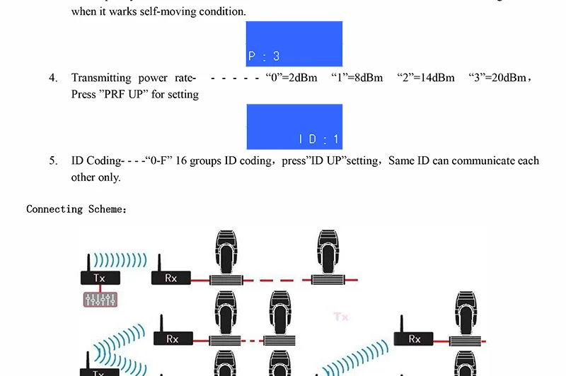 Беспроводной ЖК-приемник/передатчик поможет вам избавиться от бесчисленных проводов и избавиться от ограничения длины провода. Это будет большой помощью, чтобы помочь вам провести отличные вечерние.Особенности:DMX512 беспроводной приемник/передатчик передают стандартные DMX512 протокол данных беспроводным способом, которые решают вопросы управления освещением беспроводной передачи полностью между консолью и освещением, освещением и так далее, полностью избавьтесь от подключения кабеля. И также может гарантировать, что без задержки во время передачи данных сигнала, данные сигнала в реальном времени и надежно.126 каналов прыжки частоты само-движение, само-движение к опции без помех Частотная секция, обеспечение связи является надежным.16 групп ID кодирования для настройки, пользователь может использовать 16 групп индивидуальной беспроводной сети без каких-либо помех друг другу в том же месте.4 класса Выходная мощность для опции.Характеристики:Модель продукта: DMX512 беспроводной приемник/передатчикЭффективный диапазон: 400 м (видимое расстояние)Максимальная мощность: 20 дБмЧувствительность приема: -94dBmРазъем DMX: 3-контактный Штекерный разъемЧастота: 2,4G ISM 126 каналовИдентификационное кодирование: 16 группДисплей: 2*8 бит ЖКВходное напряжение: 9-12 В DC 300 мА МинСтандарт штепсельной вилки: штепсельная вилка европейского стандарта, штепсельная вилка американского стандарта (опционально)Материал: алюминийРазмер изделия: 14,7*7*4 см/5,78*2,75*1,57 дюйма (Д * Ш * В)Вес изделия: 262 г/9,26 унцийПосылка Размеры: 15*15*5 см/5,9*5,9 * 1.96in ( L * W * H)Вес посылка: 401 г/14,17 унцийПосылка:1 * ЖК DMX 512 беспроводной передатчик приемник1 * адаптер1 * Спецификация (на английском языке)