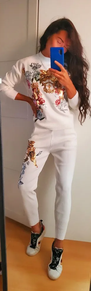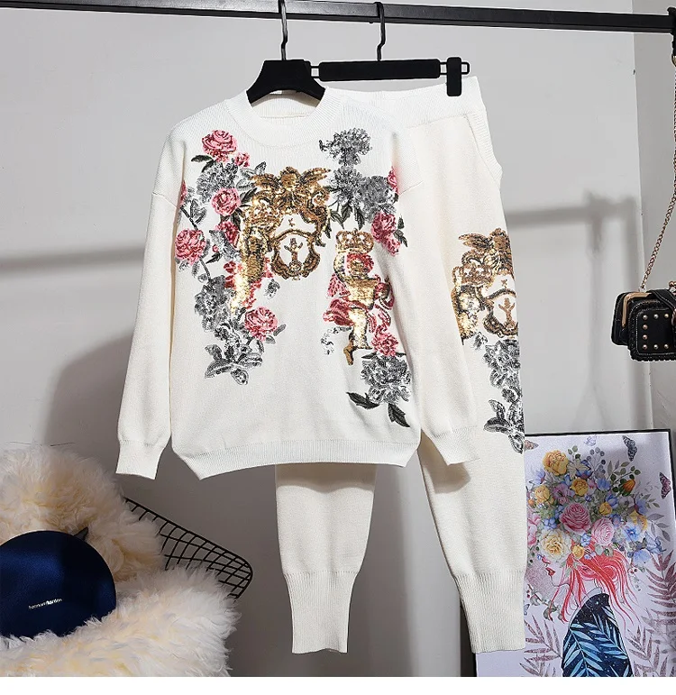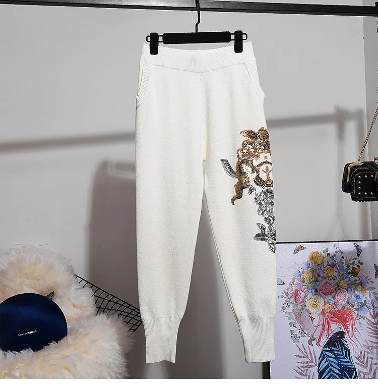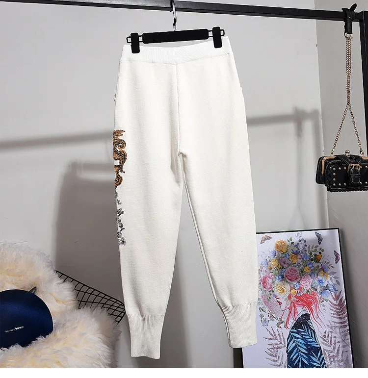 Женский комплект из двух предметов, вязаный свитер с цветочной вышивкой и штаны-шаровары, свободный, в Корейском стиле, Осень-зима