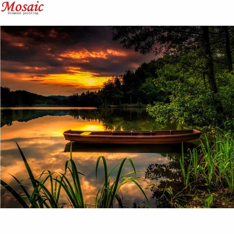 Алмазная вышивка, закат, пейзаж, 5D алмазная живопись, квадратная Алмазная мозаика, полный набор стразы, озеро, картина с изображением лодки, домашний декор