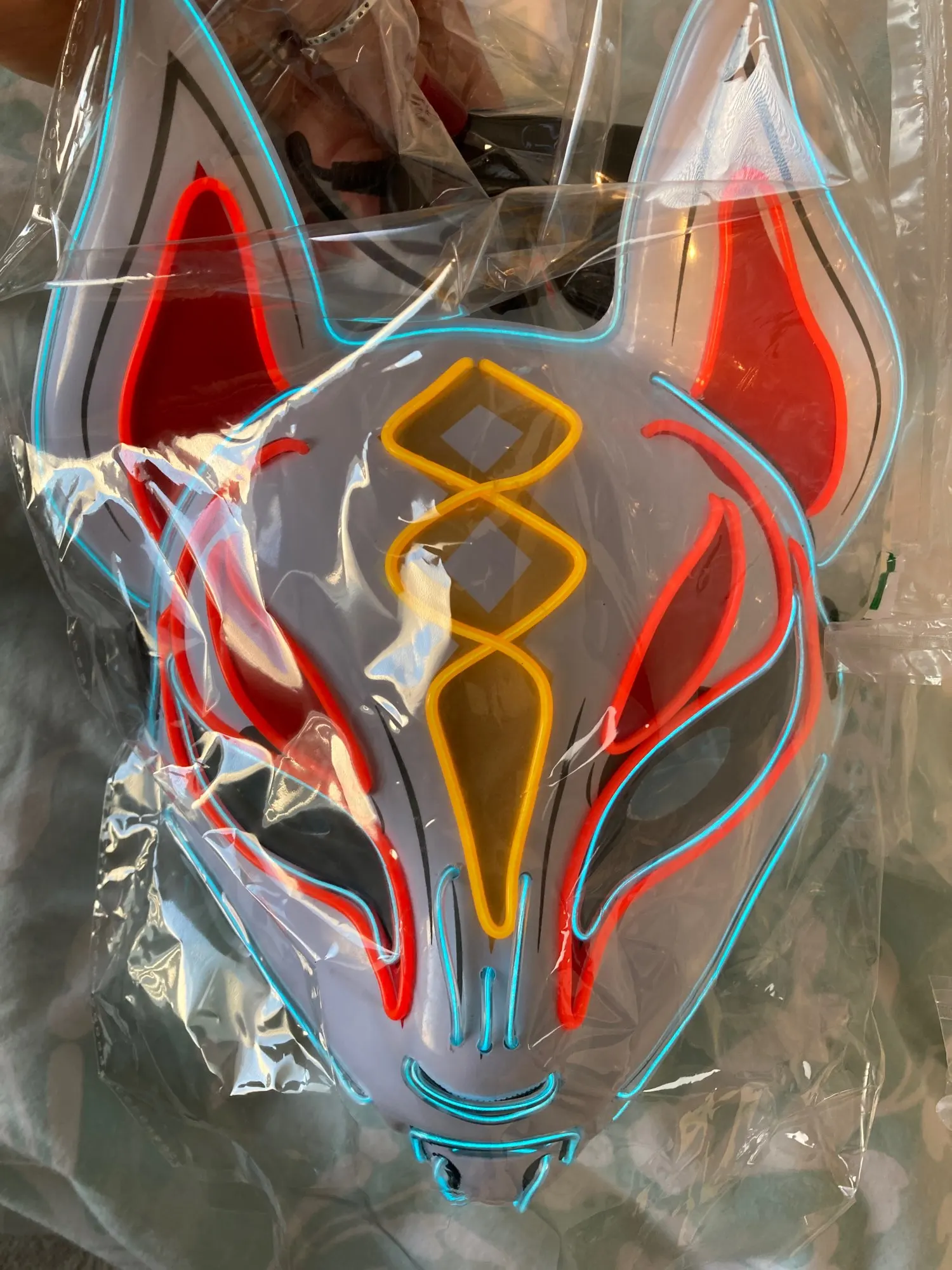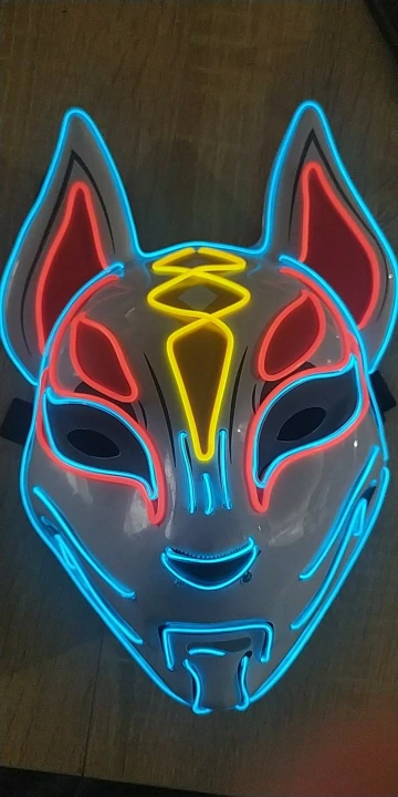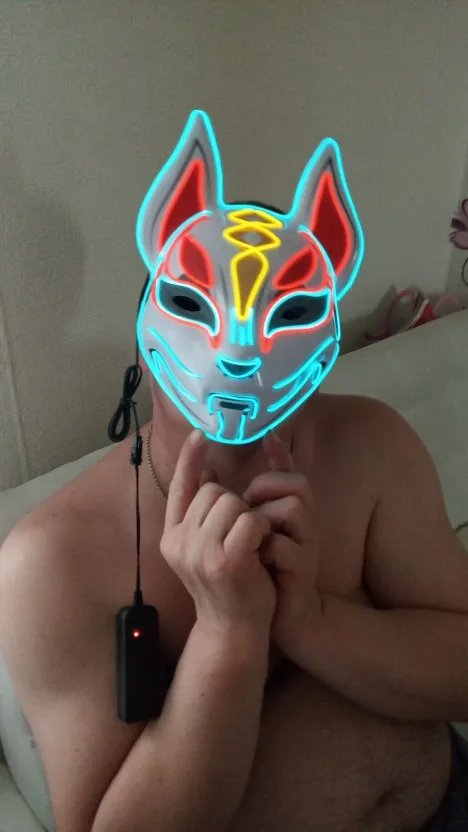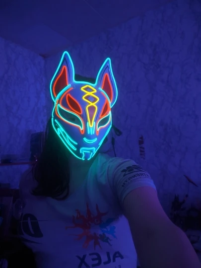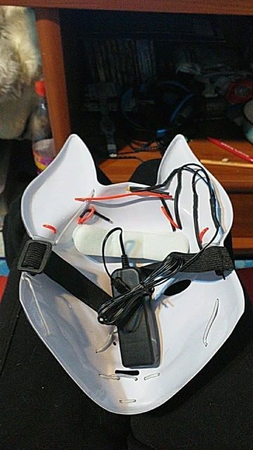 Заказывали для мероприятия шесть масок разных цветов. Доставлены в Москву очень быстро, в коробке, все целые. Изготовлена маска из тонкого, но прочного пластика, крепится на регулируемую резинку, внутри - есть поролоновая прокладка в районе лба. Удобно носить, но на женское и детское лицо - ок, на мужское, подозреваю, будет мала. Светится ярко, глаза не слепит. Провод длинный, подключается к блоку питания, работающему от двух батареек АА (в комплект не входят). При работе блок питания противно пищит, но довольно тихо, если прятать в карман - и не услышишь. Есть три режима работы: постоянный свет и два вида мигания.
