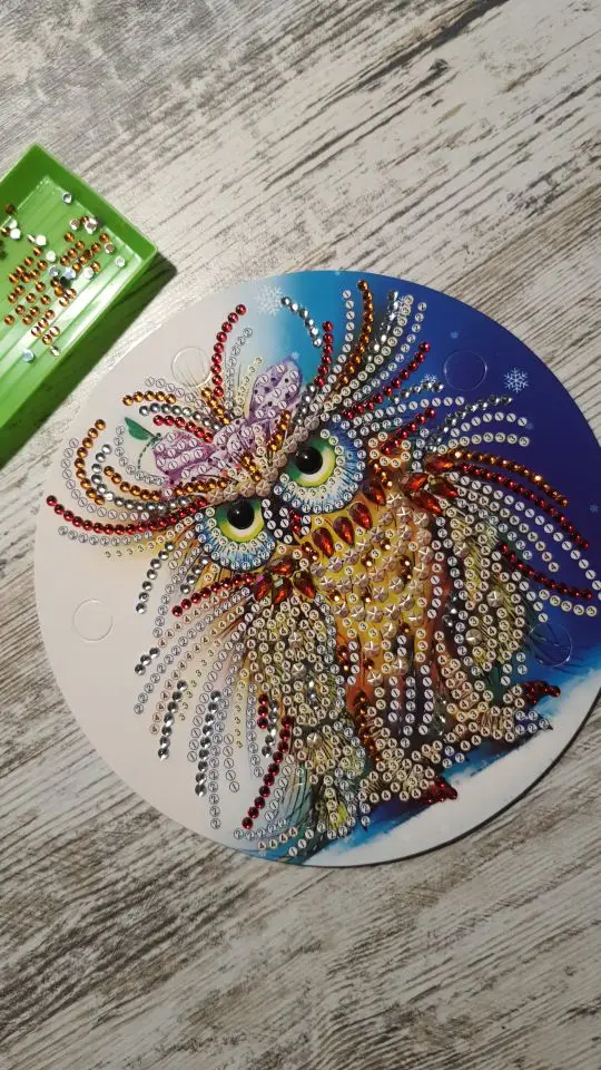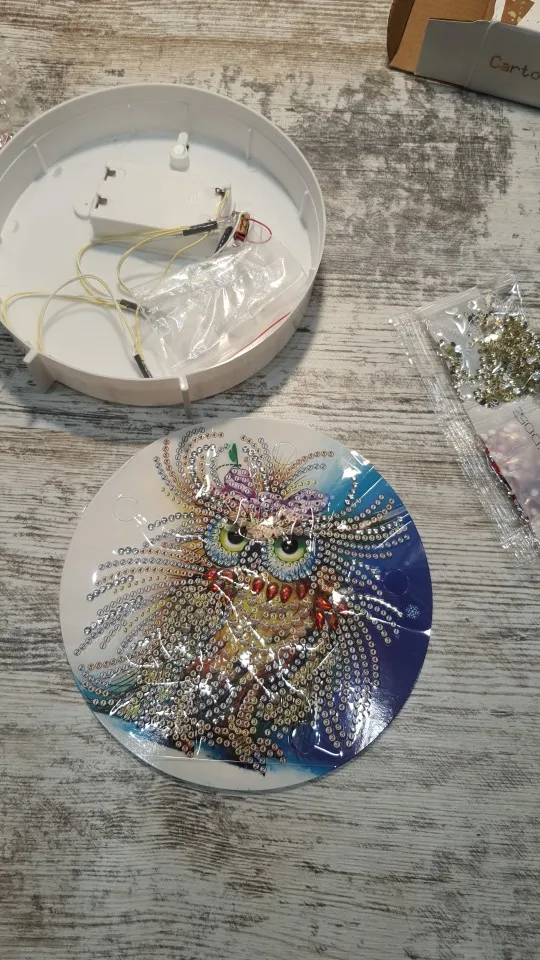 Посылка пришла быстро, трек отслеживался. Стразы сверкают, на фото не очень видно. В комплекте есть зип пакетики, что очень порадовало. Батарейки надо покупать отдельно. После завершения работы очень много осталось страз. Заказывайте,не пожалеете, очень увлекательно.