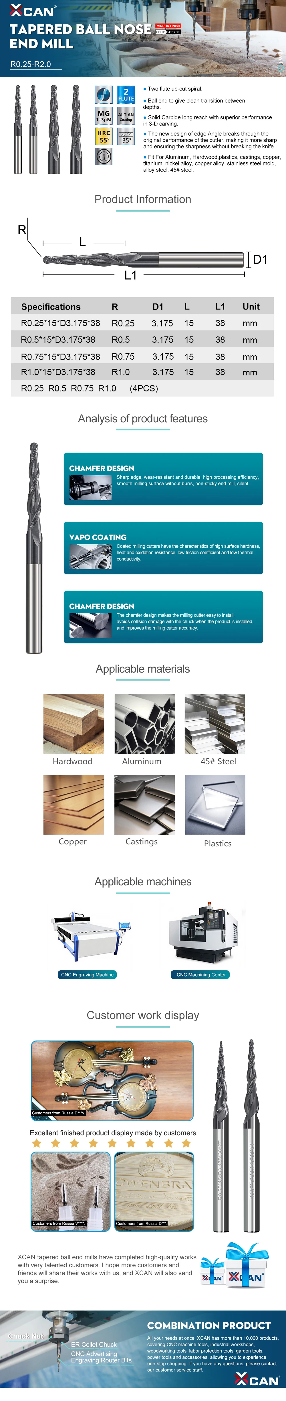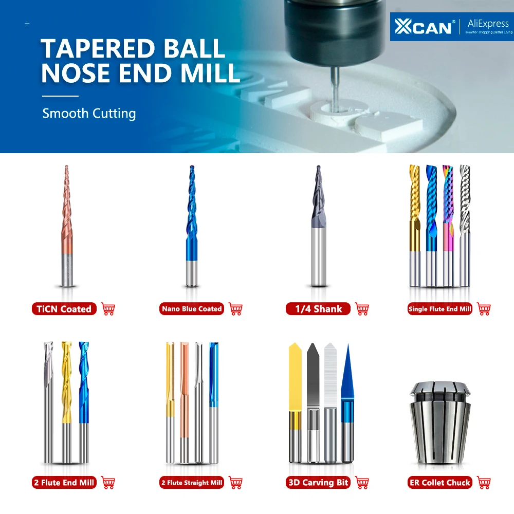 Концевая фреза XCAN R0.25R0.5R0.75R1.0, Концевая фреза с коническим шаровым концом, хвостовик 3,175 мм, твердосплавная фреза для гравировки по дереву, фреза с ЧПУ