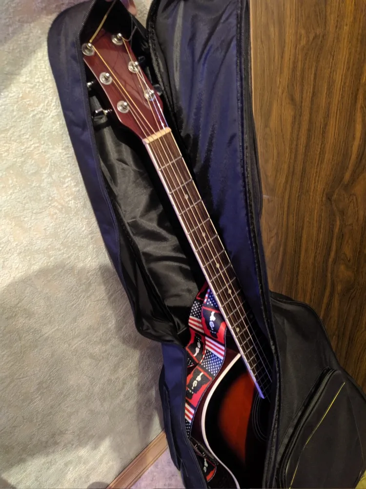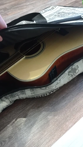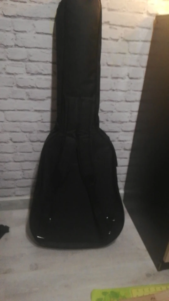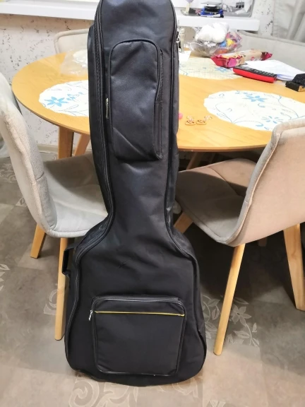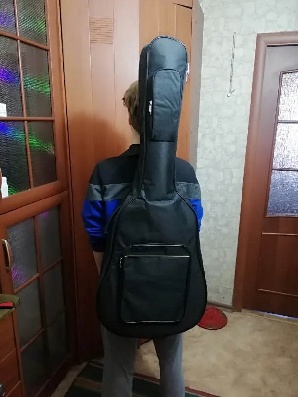 Пришел быстро, за такую цену думаю вполне хороший чехол... Плотненький, с доп кармашками) Дредноут с вырезом прям в плотную залез)) + с низу есть твердая ножка... При открытие пакета в чехле была воткнута щепка и торчали нитки, все вынул, срезал и теперь нормально. Конечно там уплотнитель где-то торчит, еще маленькие ниточки, но опять же за такую цену - хороший. + пару дешманских медиаторов))