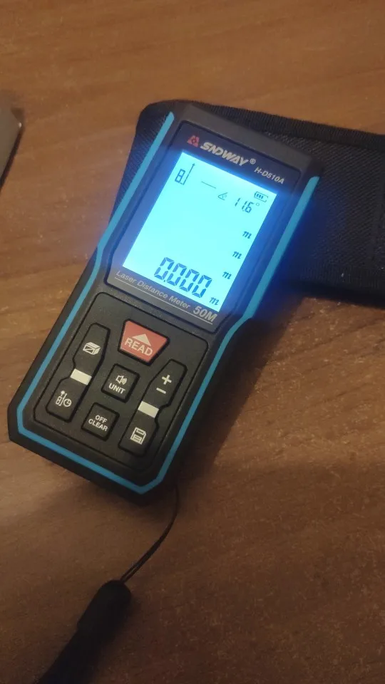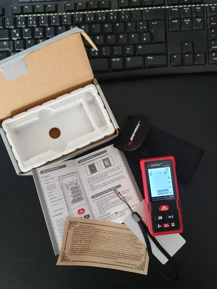 Долетел очень быстро. Калиброван из коробки. Замеры не прыгают, если целиться в одну точку, а не как я на фото)) Собрано качественно. Есть электронный уровень. В сети есть инструкция на русском. В комплекте: шнур, светоотражающая пластинка, чехол, инструкция на английском. Прибор многофункциональный. Всё супер, ни капли не пожалел о покупке.