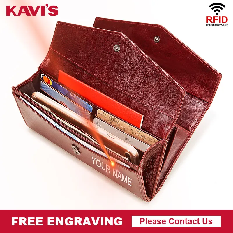 Кошелек KAVIS из натуральной кожи с бесплатной гравировкой, Дамский бумажник для мелочи, портмоне для женщин, вместительный клатч с зажимом для денег, кредитницей