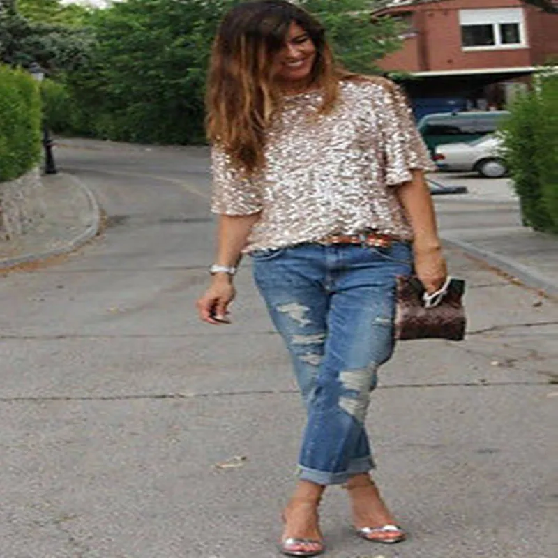 Цвет футболки розовое золото, но ближе к золотому (думала будет более розовый). Размер М на мой 42-44 сел идеально, не в обтяжку. Кофточка не короткая, живот закрывает хорошо. Вырез лодочка доходит до выступающих на плечах косточках. Пришла без затяжек, аккуратно упакована, расшита пайетками, очень красиво блестит. Продавца советую, заказ пришел в Волгоград за 16 дней.