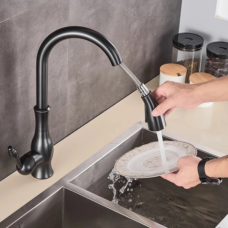 Черный кухонный кран выдвижной Однорычажный смеситель для воды кран и смеситель для кухонной раковины, поворотное крепление на палубу с поворотом на 360