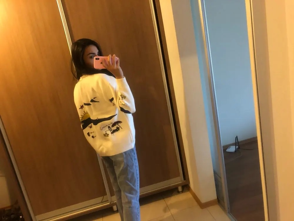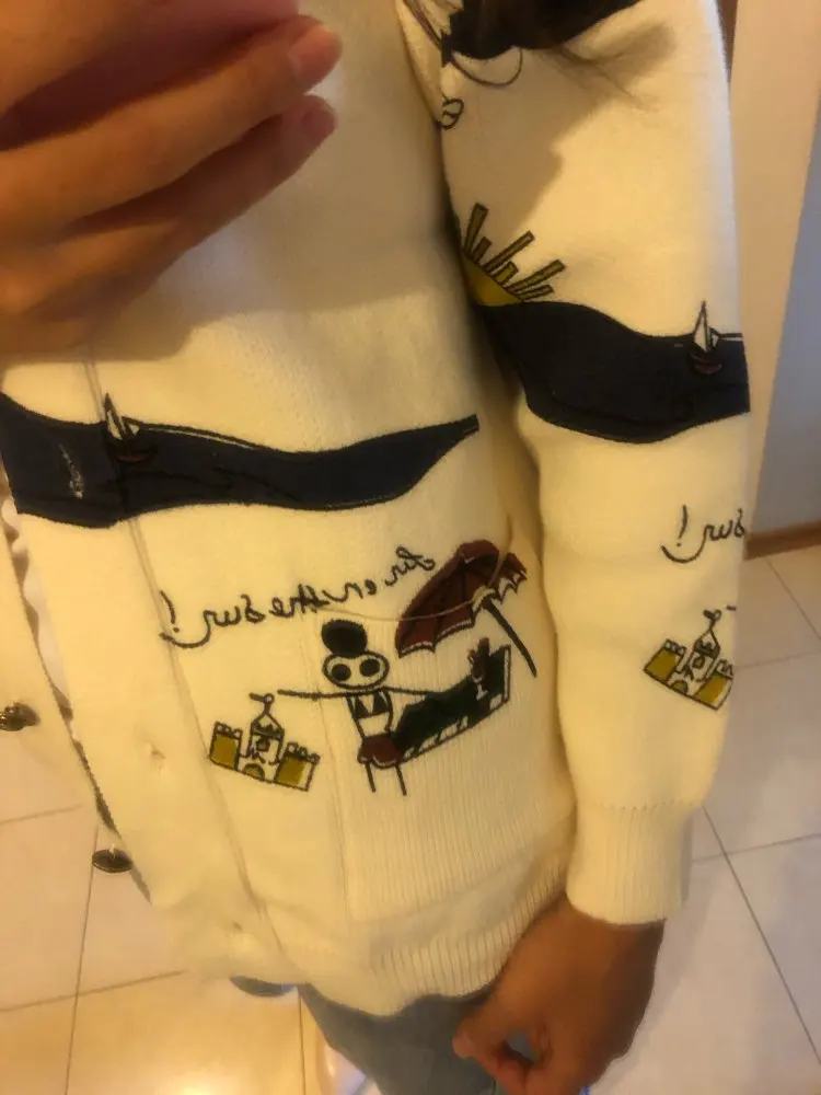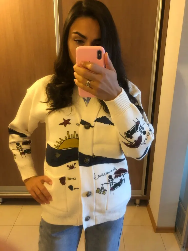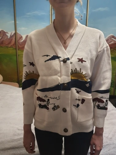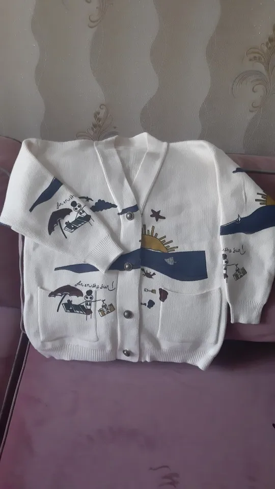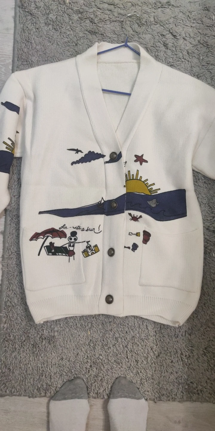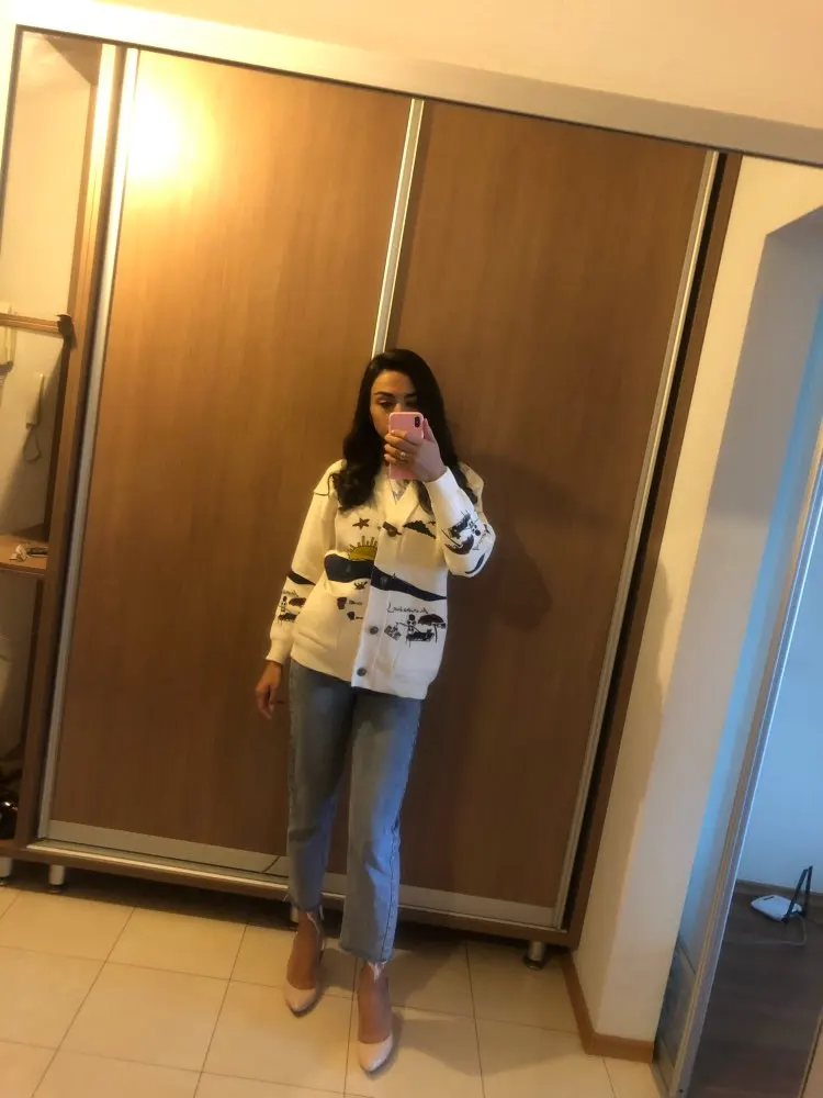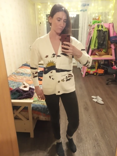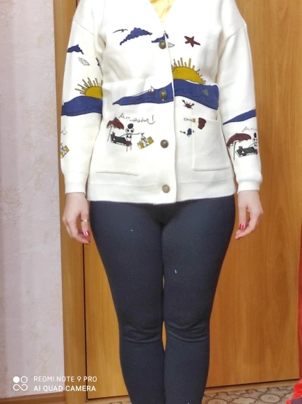 Добротный тяжеленький хлопковый кардиган. Плотный. Приятный к телу. У меня получились немного большеватыми плечи (на мой 44-46). Надеюсь этот момент уйдет после стирки. Про стирку пока тоже не понятно (так как принт визуально нанесен на нити и есть ощущение, что все это может уйти после стирки. Напишу потом как он себя ведет в уходе.
