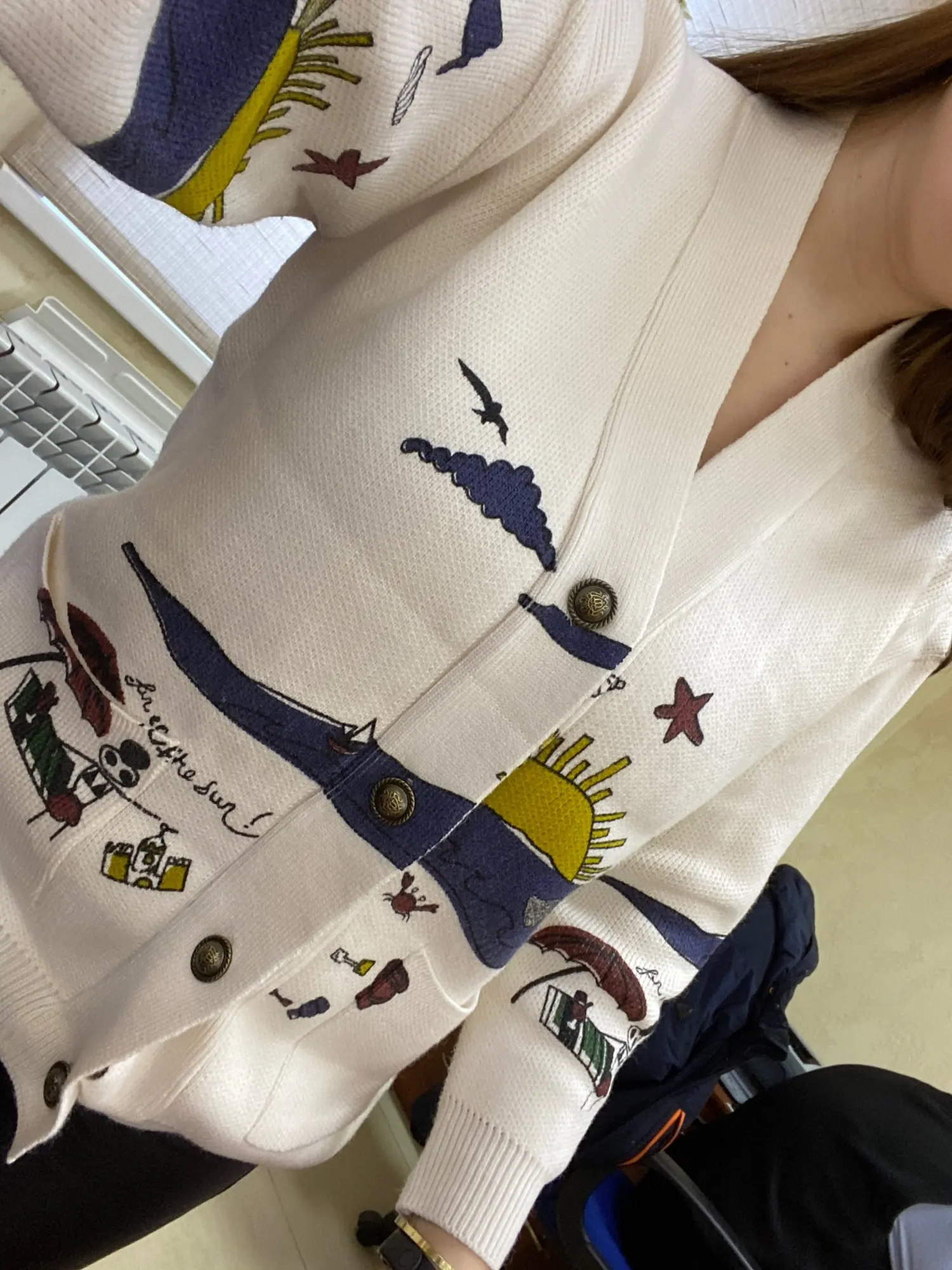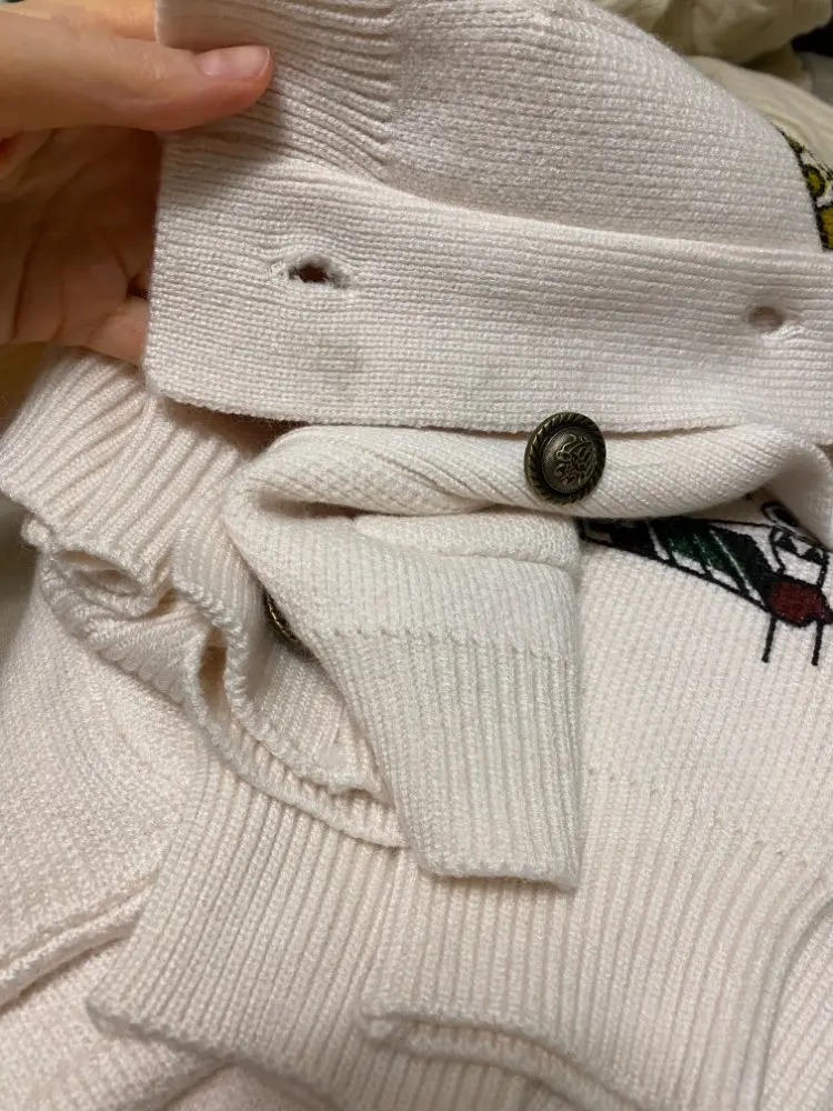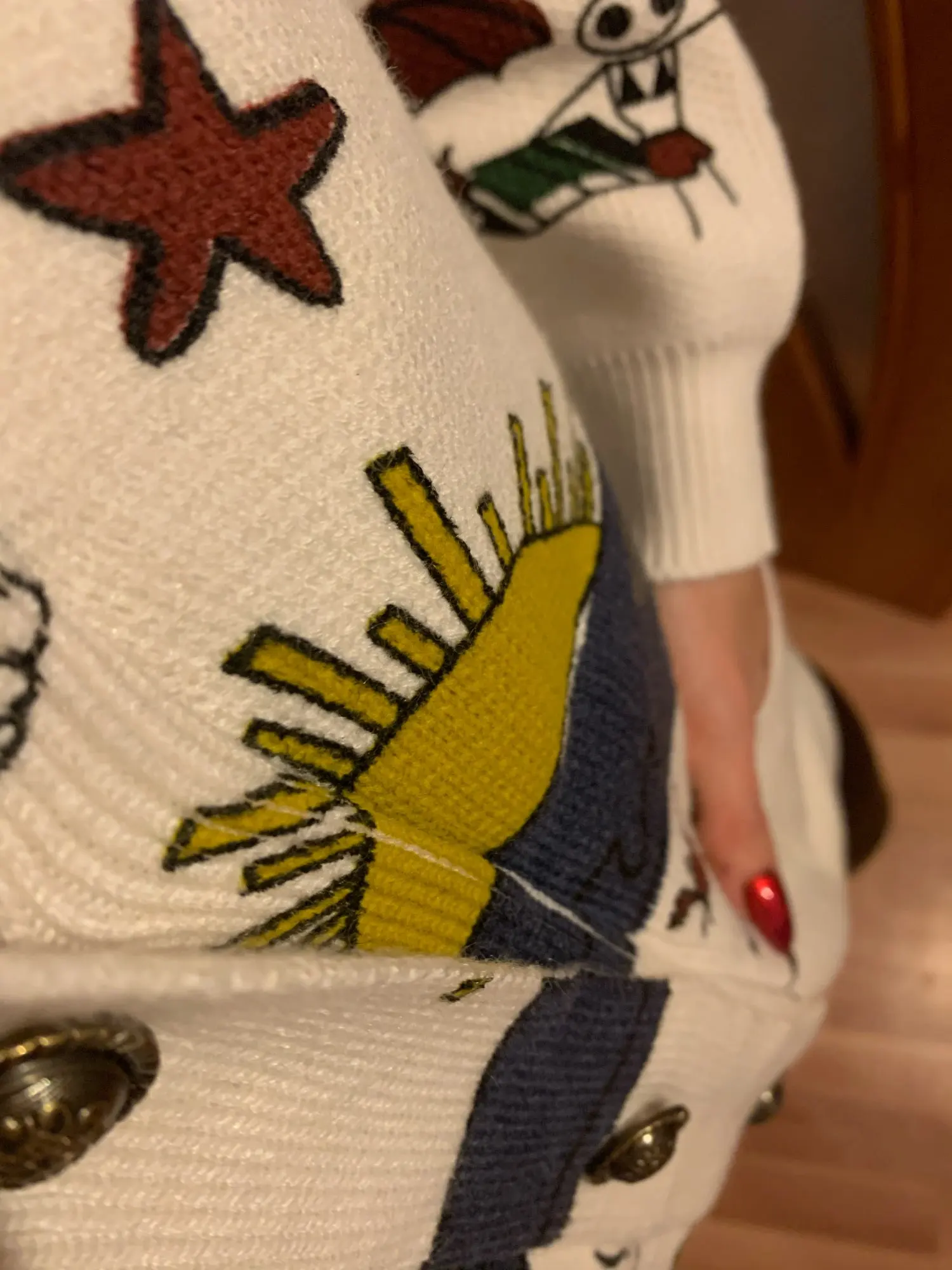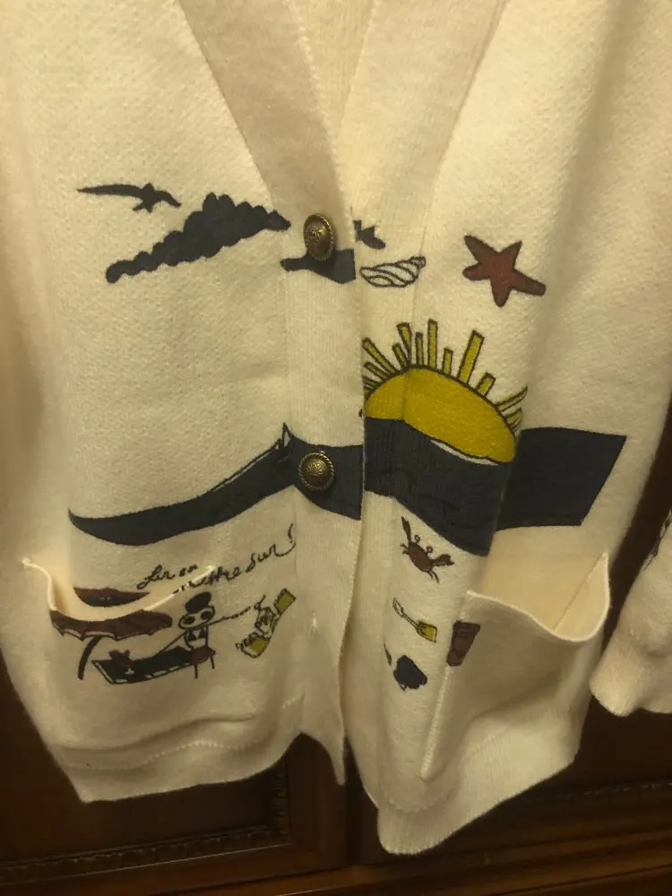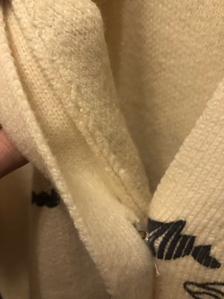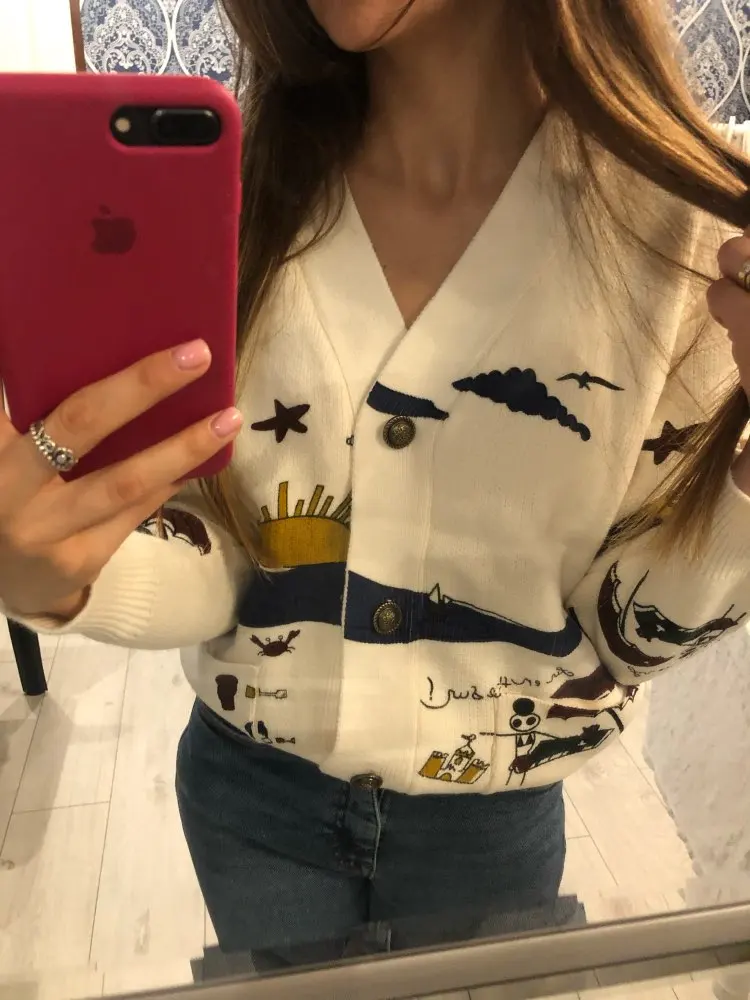 Добротный тяжеленький хлопковый кардиган. Плотный. Приятный к телу. У меня получились немного большеватыми плечи (на мой 44-46). Надеюсь этот момент уйдет после стирки. Про стирку пока тоже не понятно (так как принт визуально нанесен на нити и есть ощущение, что все это может уйти после стирки. Напишу потом как он себя ведет в уходе.
