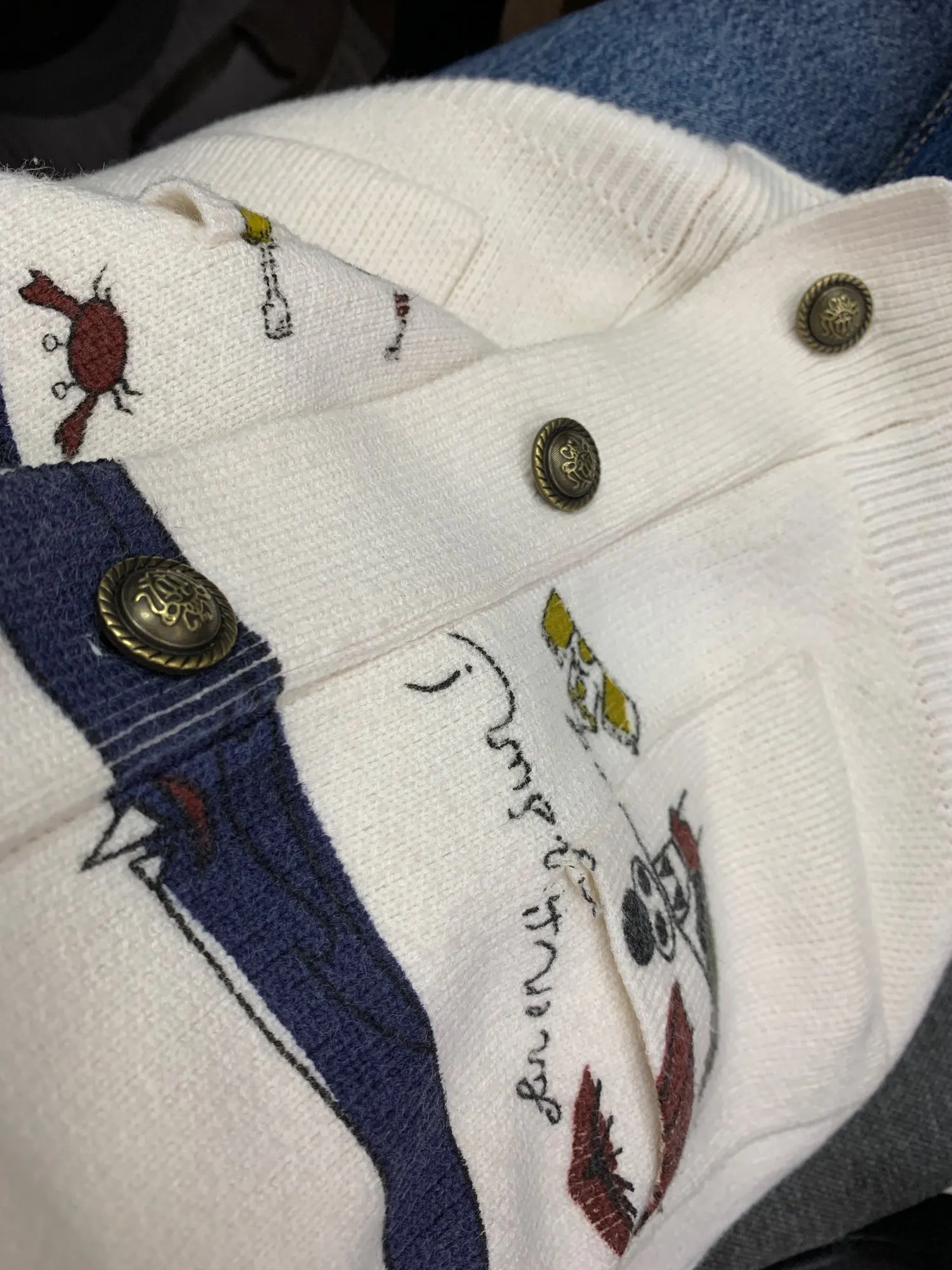 Кофточка пахнет, посмотрим что будет после стирки. Рисунок не вышивка, а краска. Как долго продержится не знаю. Швы под пуговицы неровные и скоро им хана. Сама кофта приятная на ощупь, мягкая. Что за материал не могу понять, нет никакой бирки.