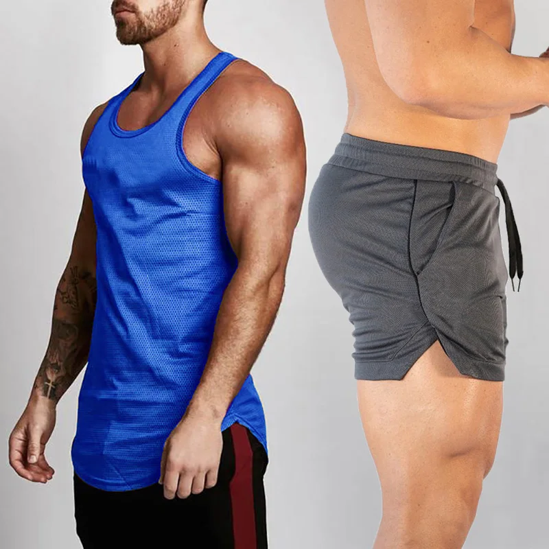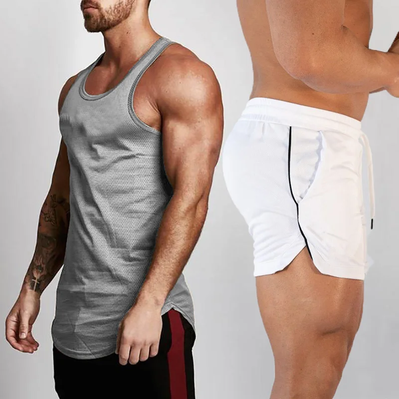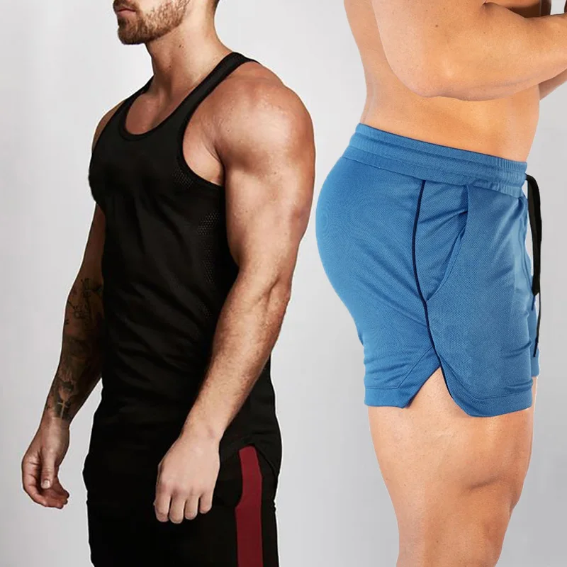 Мужской спортивный костюм, майка и шорты, спортивный костюм для бодибилдинга, фитнеса, уличная одежда, сетчатые штаны, 2 шт.