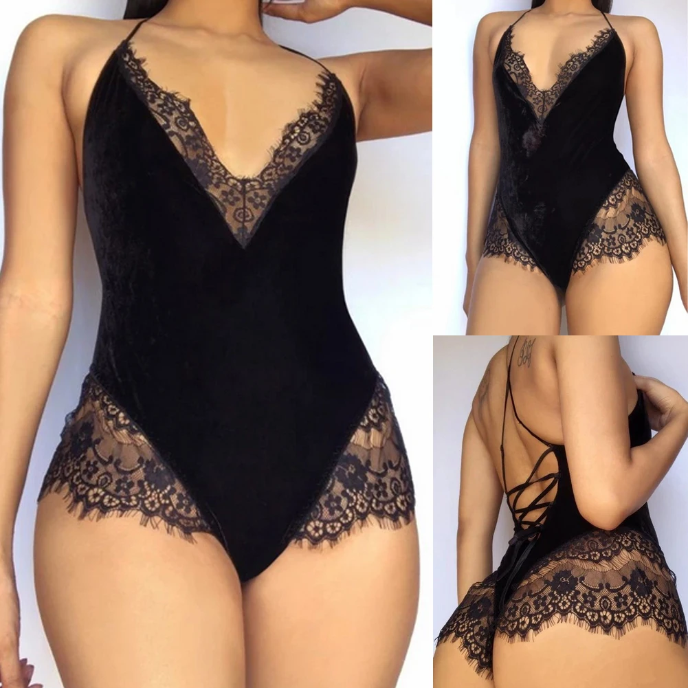 Женский кружевной комбинезон, черное сексуальное нижнее белье с V-образным вырезом, на бретелях