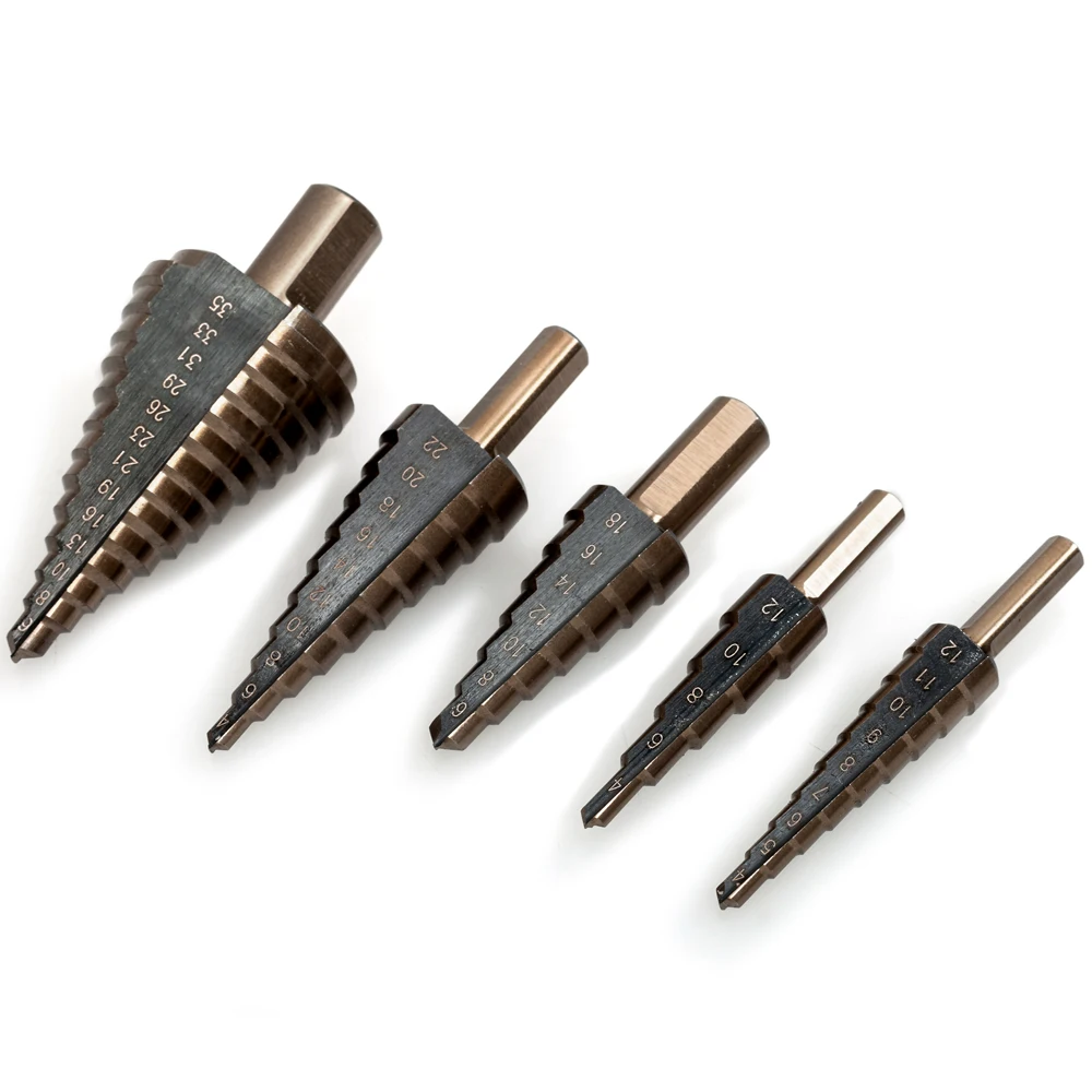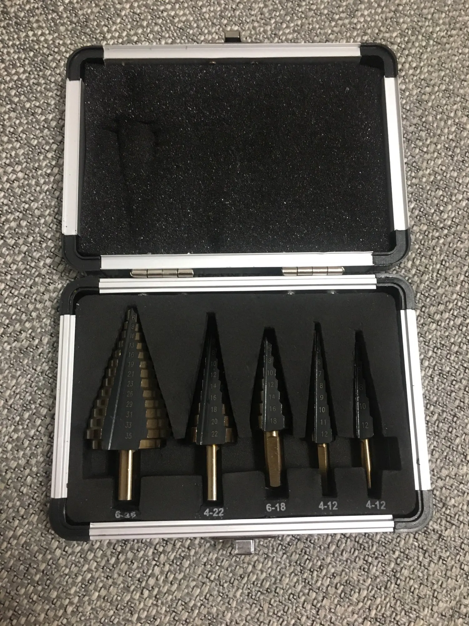 ALLSOME 5pcs MetricInch Hss Cobalt Step Drill Bit Set Multiple Hole 50 Sizes with Aluminum Case