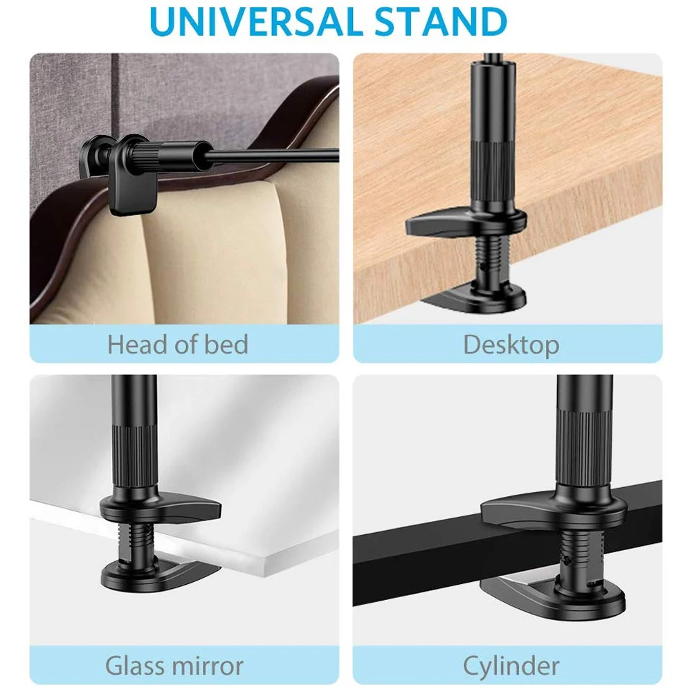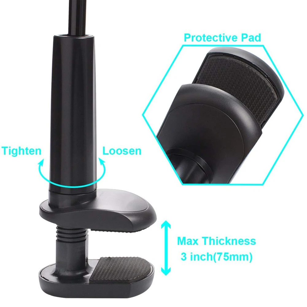Характеристики продукта:1. Складной портативный, простой в использовании.2. Съемный может свободно сочетаться.3. Подходит для 4-11 дюймов мобильный телефон и планшетный ПК.4. Вращение экрана на 360 градусов.5. Можно использовать на кровати и рабочем столе.6. Свободные руки, Наслаждайтесь жизнью7. Жесткий полюс с вращением на 360 градусов8. Качественная отвертка, может зажимать Макс 75 мм толщиной.