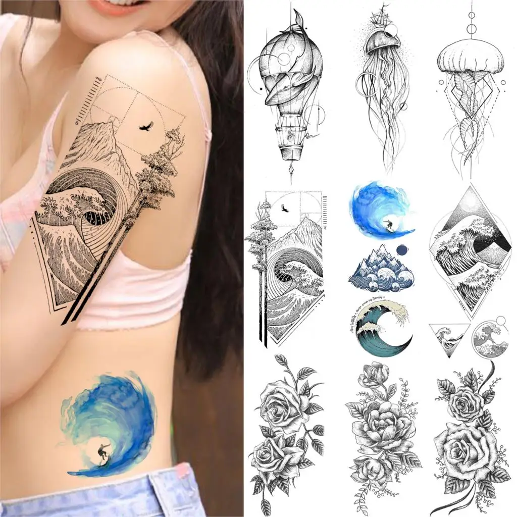 Временные тату морские волны для серфинга для женщин и мужчин, водостойкие искусственные тату-тату на руку, Арт, медуза, Кит, пион, цветок, наклейка