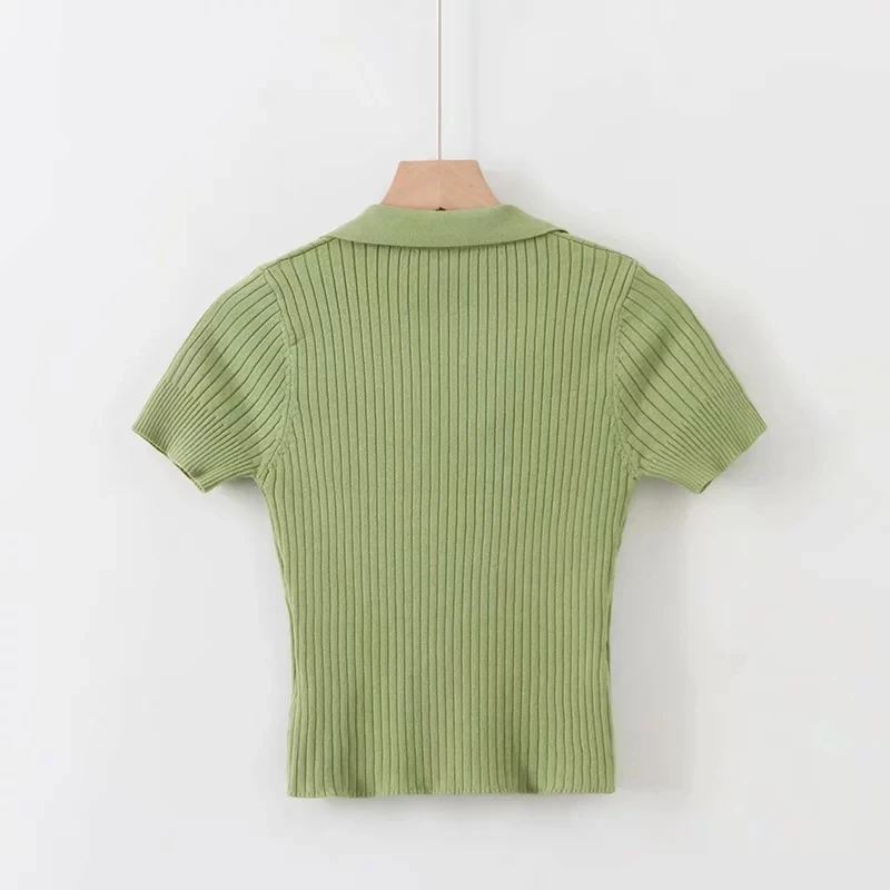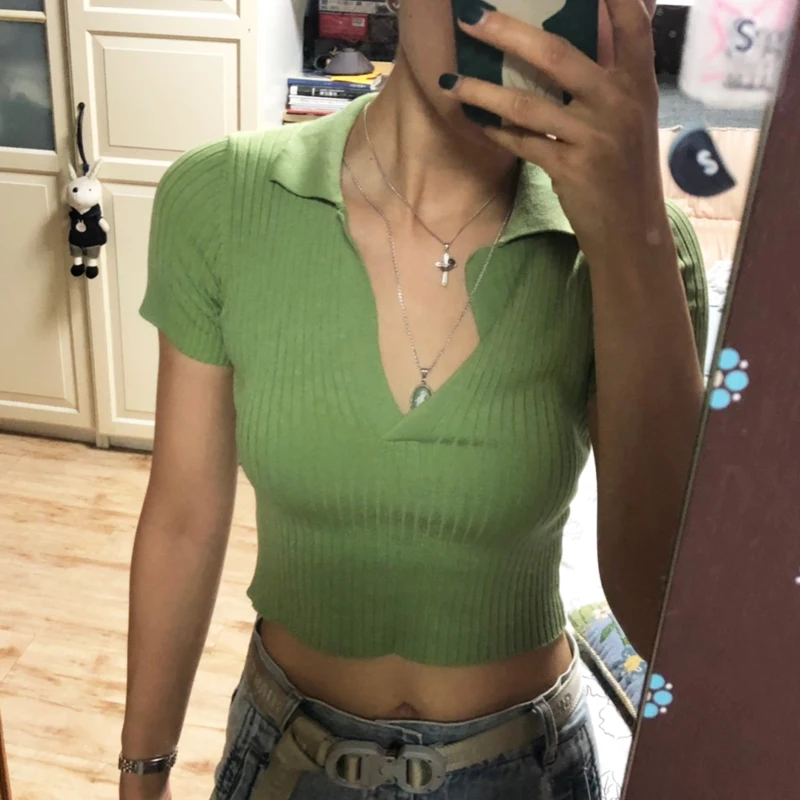 Женская трикотажная футболка-поло в винтажном стиле, зеленая и белая укороченная футболка с коротким рукавом в Корейском стиле, 2019