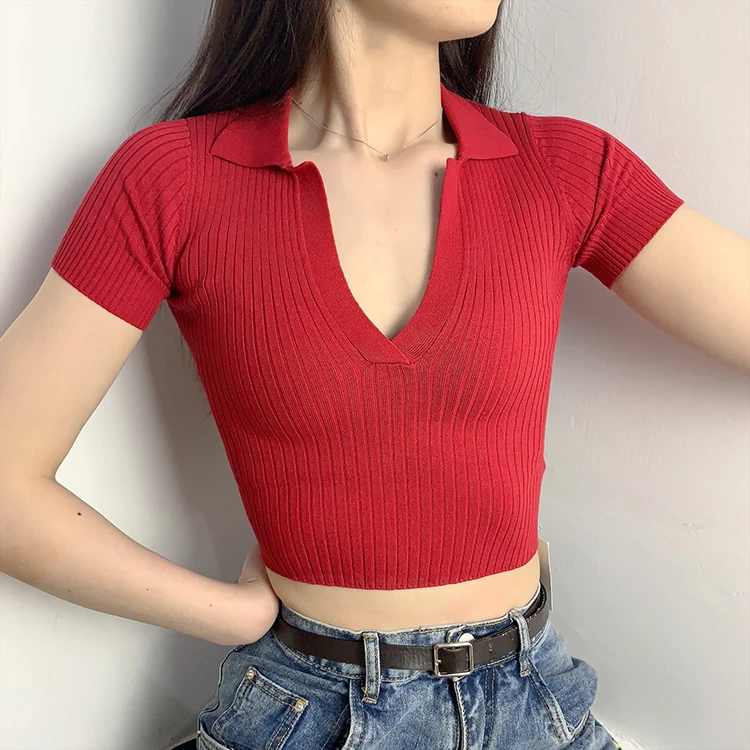 Кроп-Топ женский в рубчик, с коротким рукавом и V-образным вырезом,...
