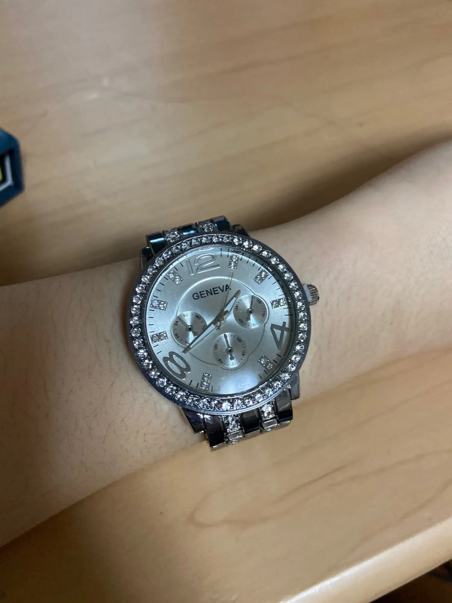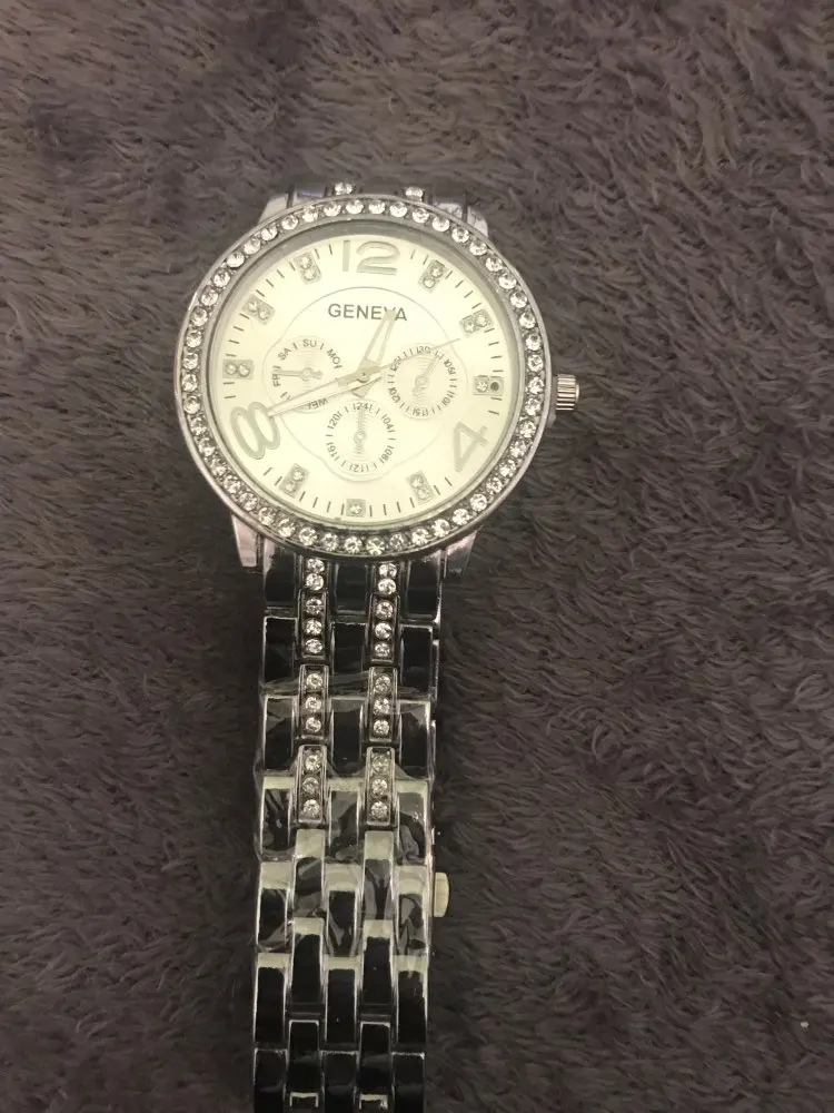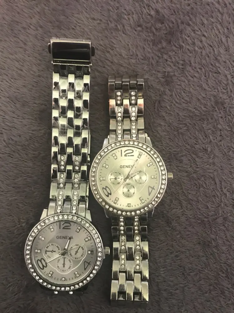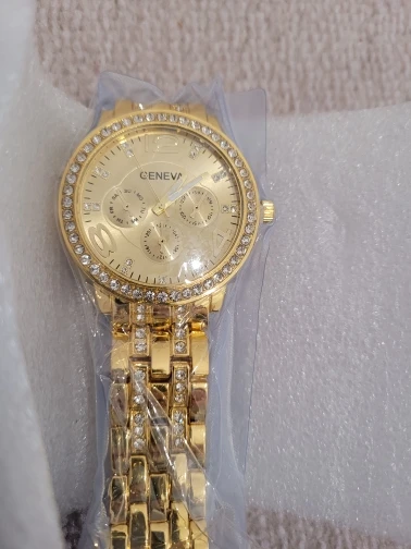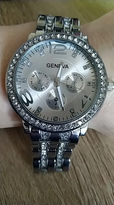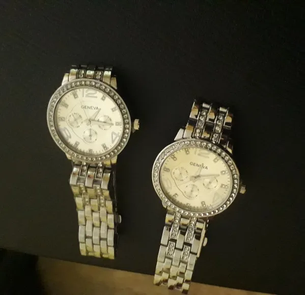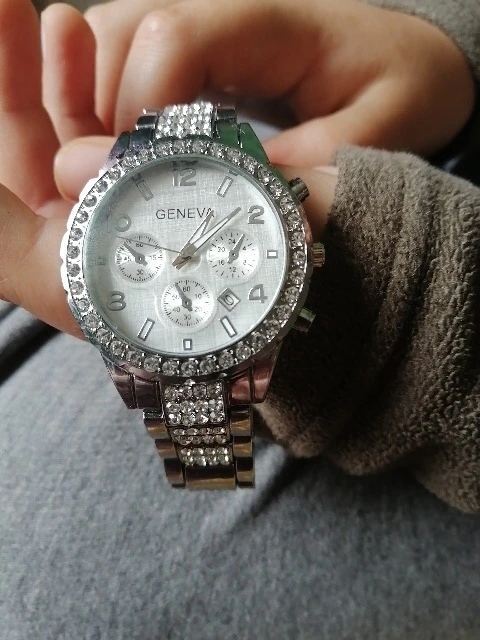 Эти часы Потрясающие. Это замена моего старого. Все еще работает абсолютно нормально. Я просто побила его и носила его каждый день в течение пяти лет, поэтому я хотел новый для случайных случаев и держать второй на каждый день. Часы такие же, как на фото. Идентично старому. Маленькие бриллианты никогда не выпадали, но этот новый драгоценный камень отсутствует на лице под номером 3. Таким образом, мы увидим с этой заменой слева