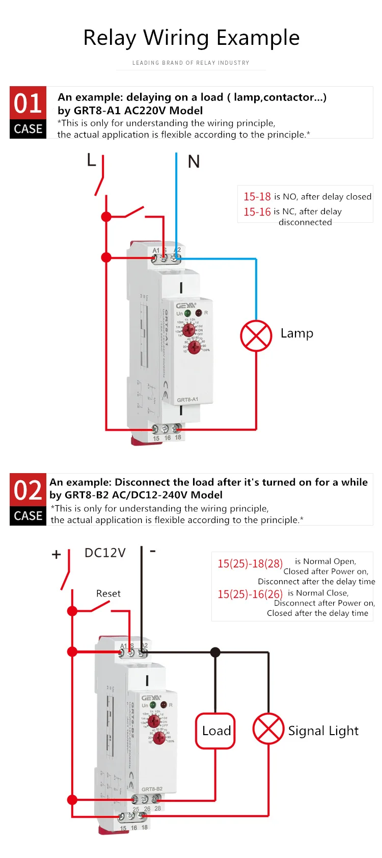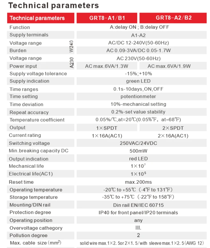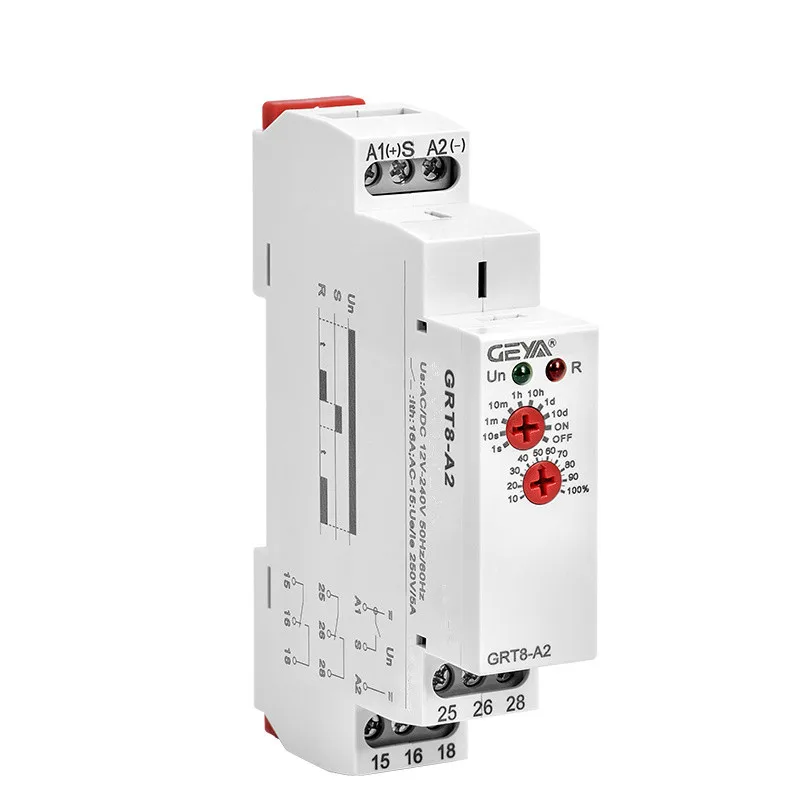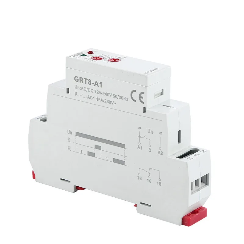 Приложений -Подходит для приложений, где известны функции и временные требования. -Переключатель времени, можно использовать для распада насоса после выключения нагрева, переключения вентиляторов. Функции -GRT8-A задержки -Поддержка широкого диапазона напряжения: AC/DC12-240V или AC230V -Выходной контакт: 1SPDT или 2SPDT -Временной шкалой 0,1 s - 10 дней разделены на 10 диапазонов, настройка времени с помощью потенциометр. 0,1-1s, 1-10s, 6-60s, 1-10 мин, 6-60 мин, 1-10 ч, 0.1-1 день, 1-10 дней, только вкл, только ВЫКЛ -Статус реле указан светодиодом. -1 модуль 18 мм, din-рейка.