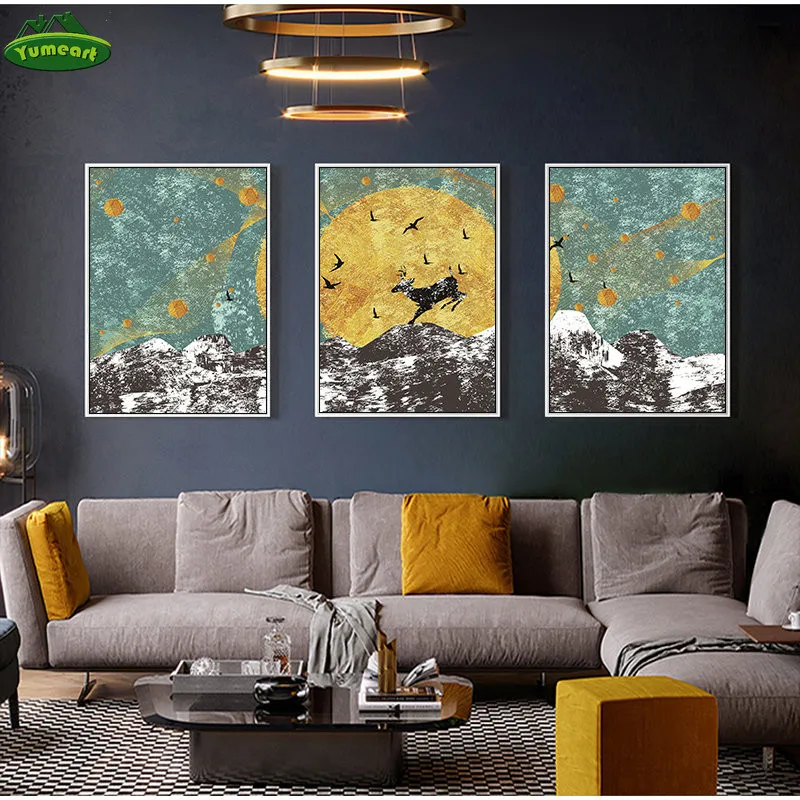 Модная картина маслом на холсте и плакаты, настенное искусство, олень и солнце, пейзаж Черной Горы, украшение для офиса, спальни, дома
