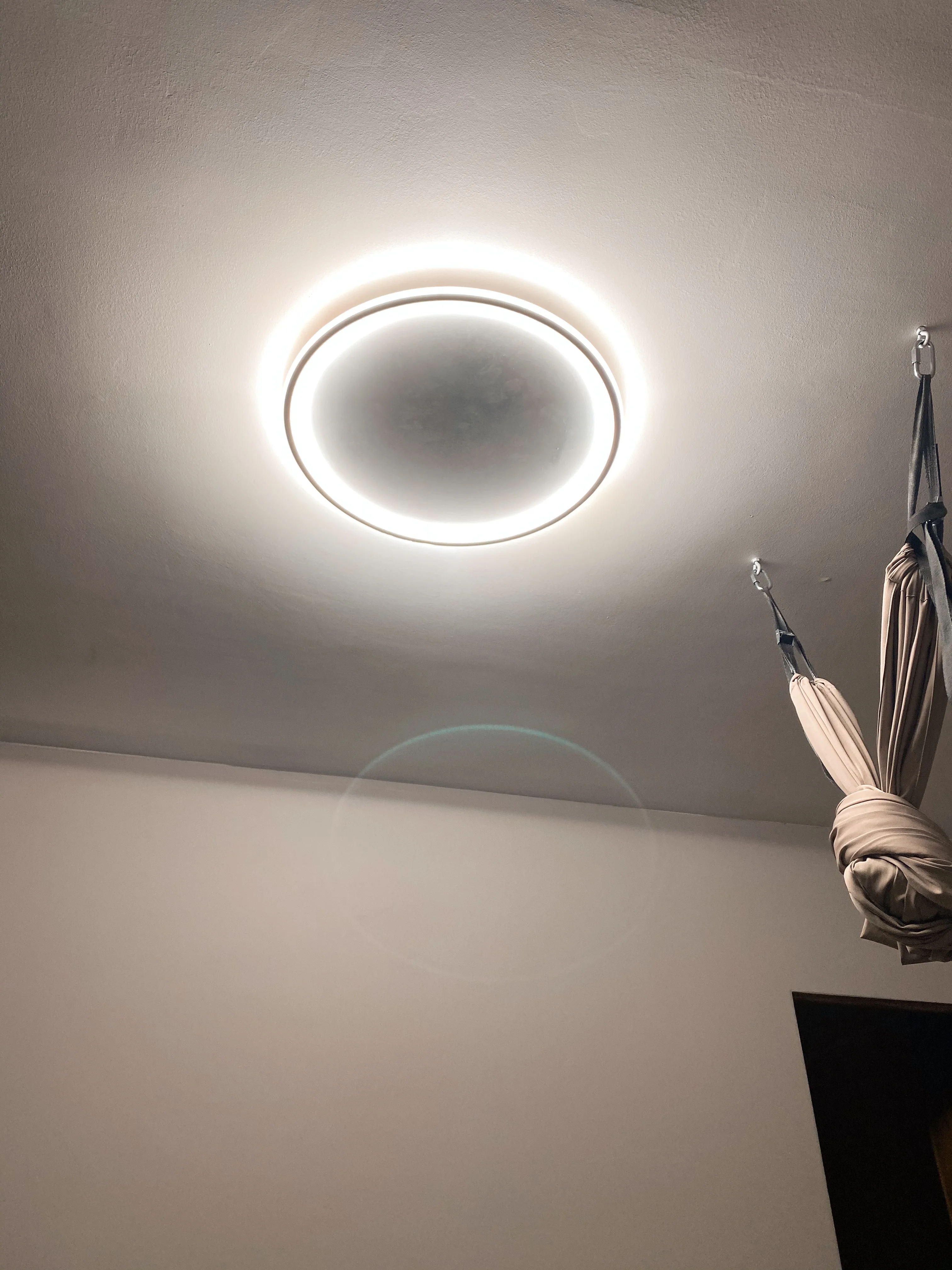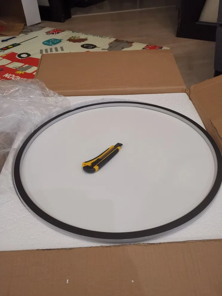 симпатичная лампа. светит ярко, на пульт реагирует, самый мощный режим не слепит. на комнату 15 м хватает +- если у вас белый потолок, будет казаться что черный ободок парит один, без внутренней белой части с креплениями пришлось повозиться, они не совсем подходили друг другу. подключение к сети без проблем, все получилось быстро до Москвы шла 2,5 месяца! :( оч долго
