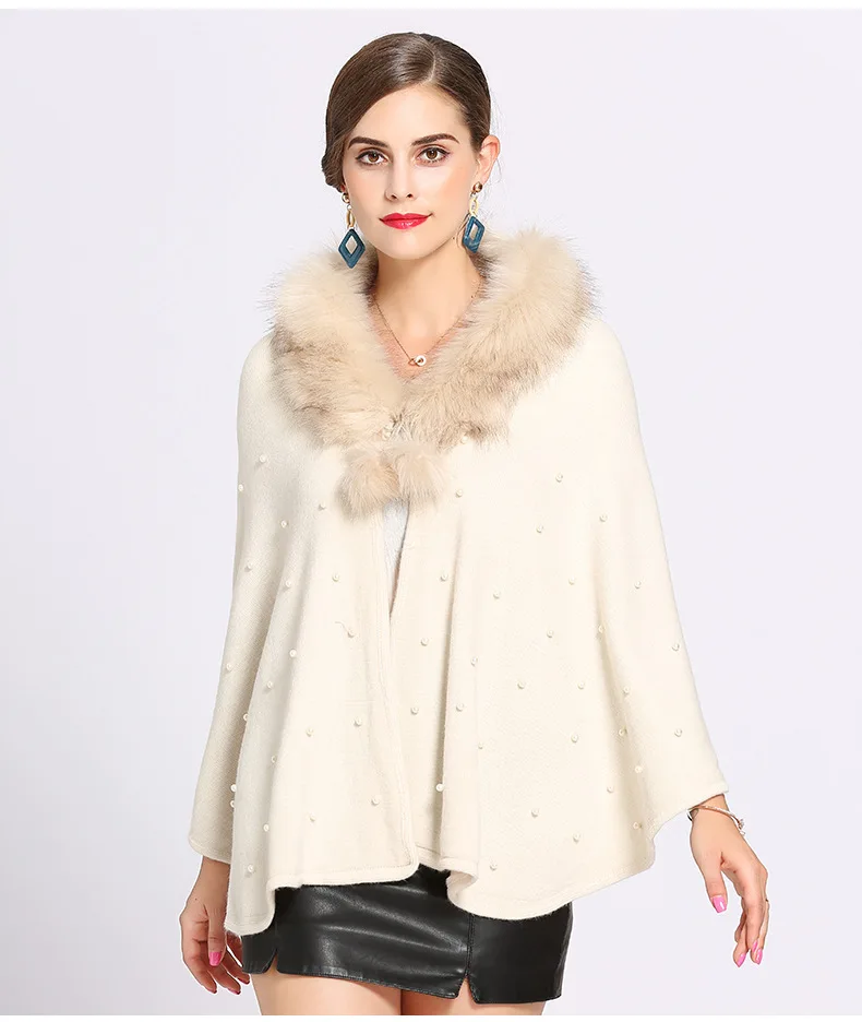 Зимняя накидка, пальто для женщин, плащ, свободная шаль, имитация лисьего меха, Кашемировое пончо, черный плащ с жемчугом