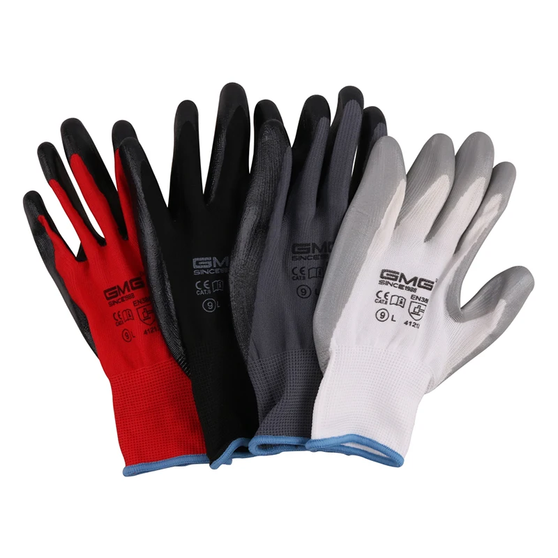 Горячая Распродажа GMG CE сертифицированный EN388 из хлопка и полиэстера Красного Цвета Черный Гладкий Нитриловый Безопасность рабочие перчатки защитные перчатки рабочие перчатки, партиями по 6 пар