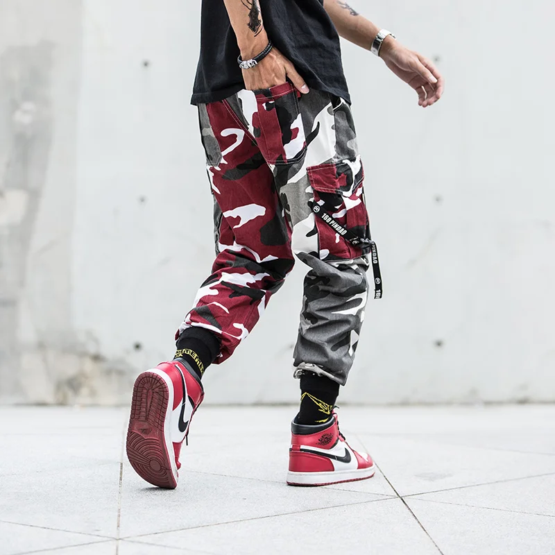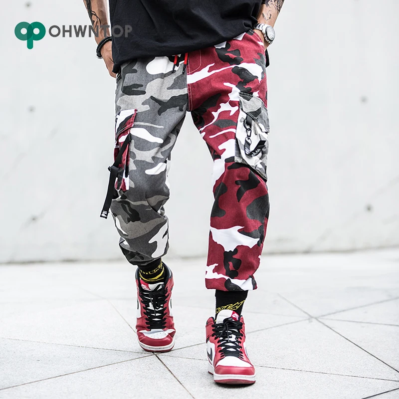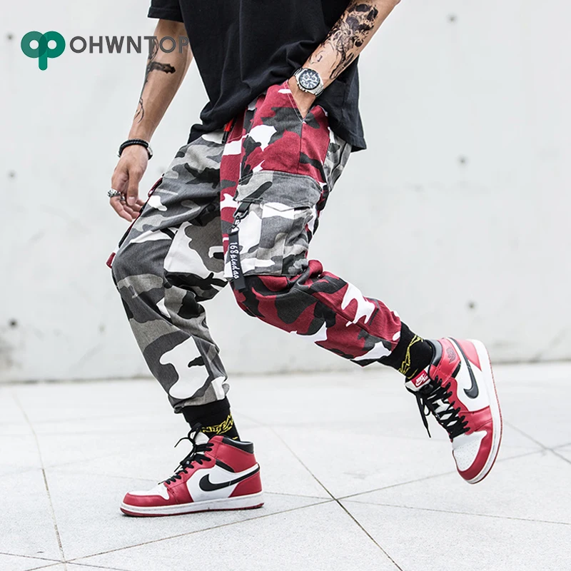 Городские брюки-карго в стиле хип-хоп, мужские Модные брюки для бега, камуфляжные брюки, уличная одежда Harajuku, брюки с боковыми карманами, шаровары с лентой