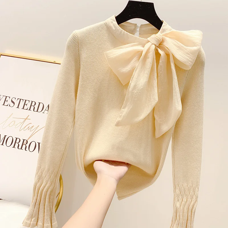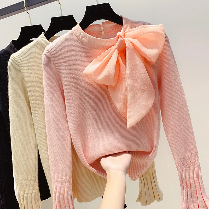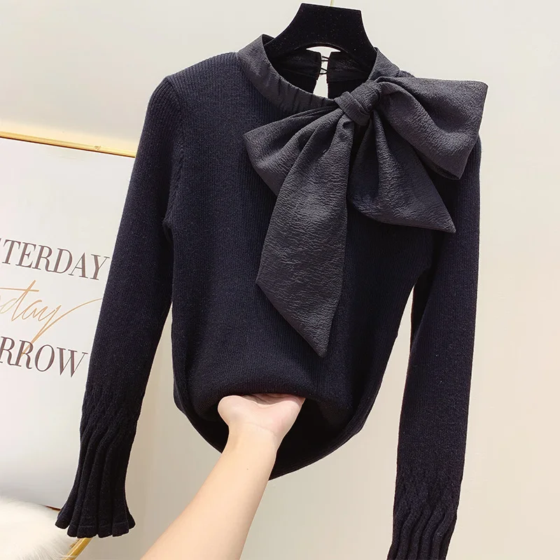 Женский объемный свитер с бантом, трикотажный пуловер в стиле ретро с расклешенными рукавами, на осень и зиму, 2019