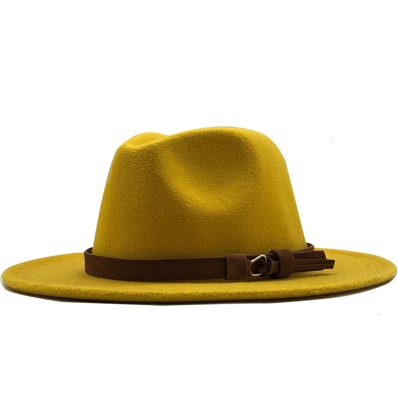 Модная шерстяная шляпа с широкими полями для мужчин и женщин, фетровая шляпа для официальвечерние, джазовая шляпа с пряжкой для ремня, желтая, оранжевая, розовая шляпа