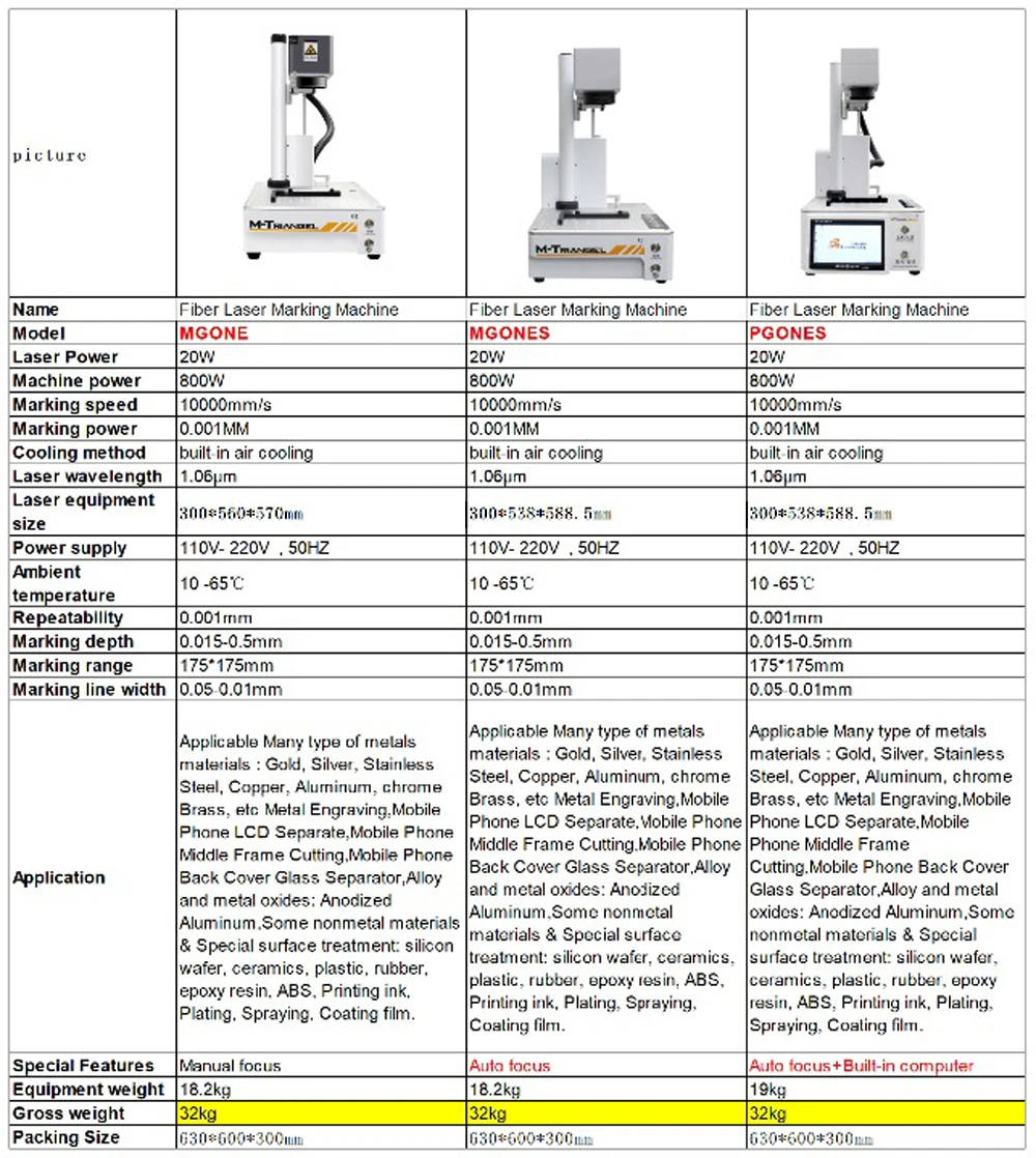 Параметры Мощность лазера: 20 Вт Мощность машины: 8000 Вт Скорость машины: ≤ 10000 мм/сек. Мощность маркировки: ≤ 0,001 мм Метод охлаждения: встроенное воздушное охлаждение Длина волны лазера: 1.06μm Источник питания: 220 В ± 10%, 50 Гц ± 5% Температура окружающей среды:-10 °C ~ 65 °C Повторяемость: ≤ 0,001 мм Глубина маркировки: 0,015-0,5 мм Диапазон маркировки: 175*175 мм Ширина маркировочной линии: 0,05-0,01 мм