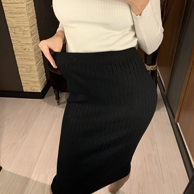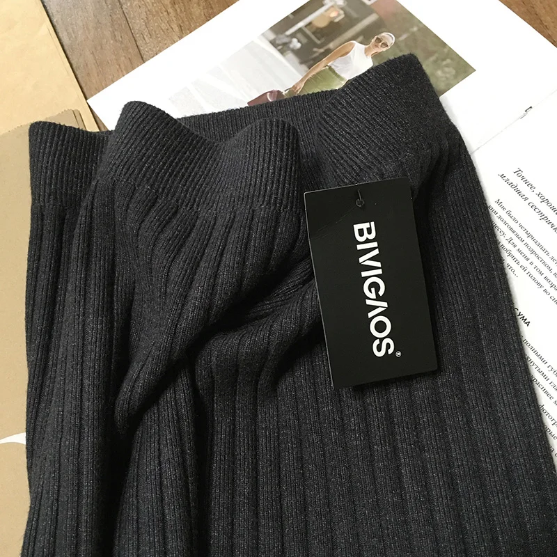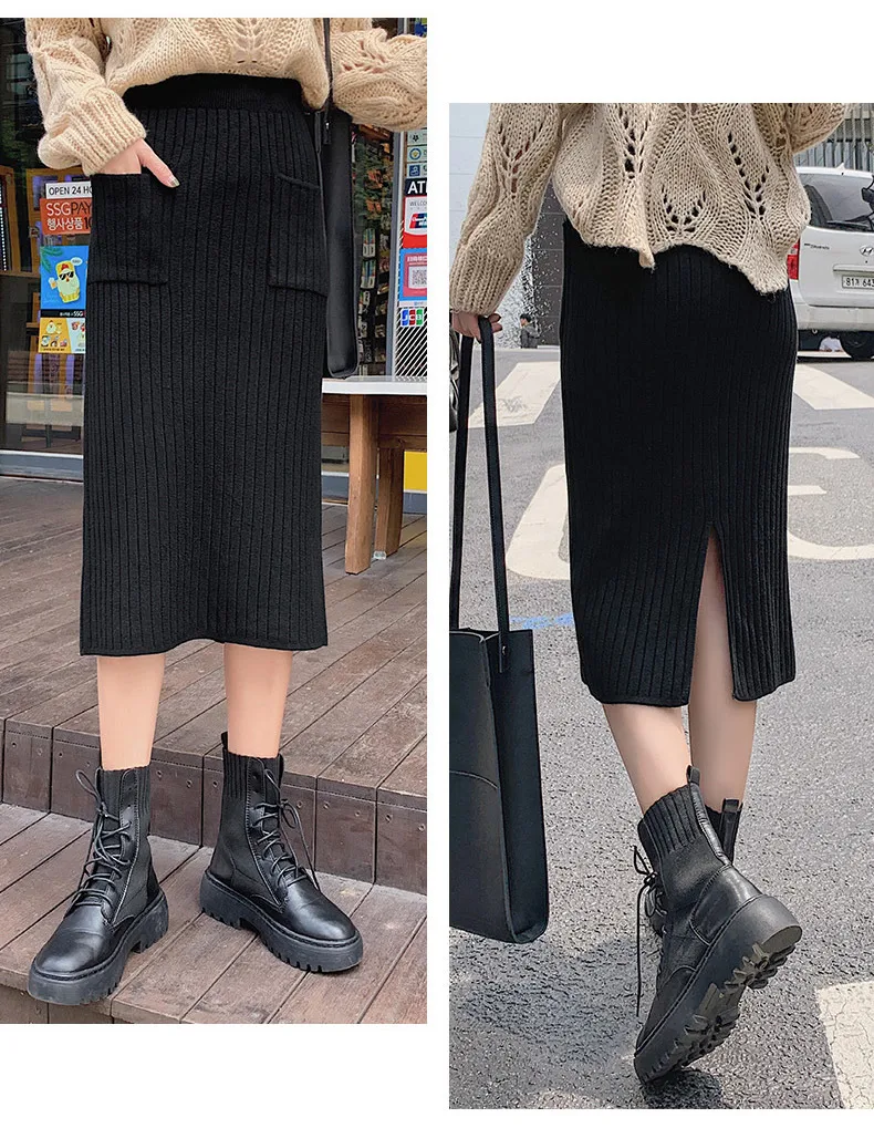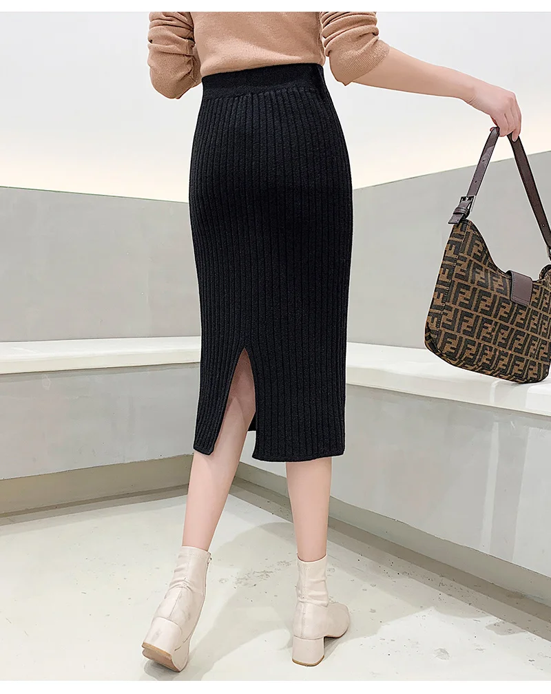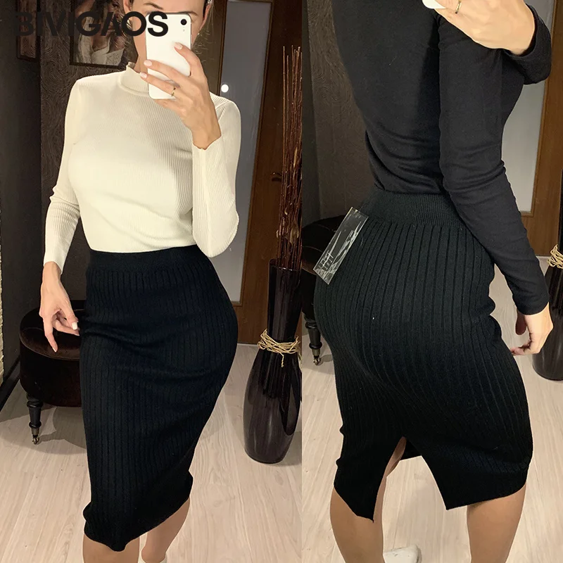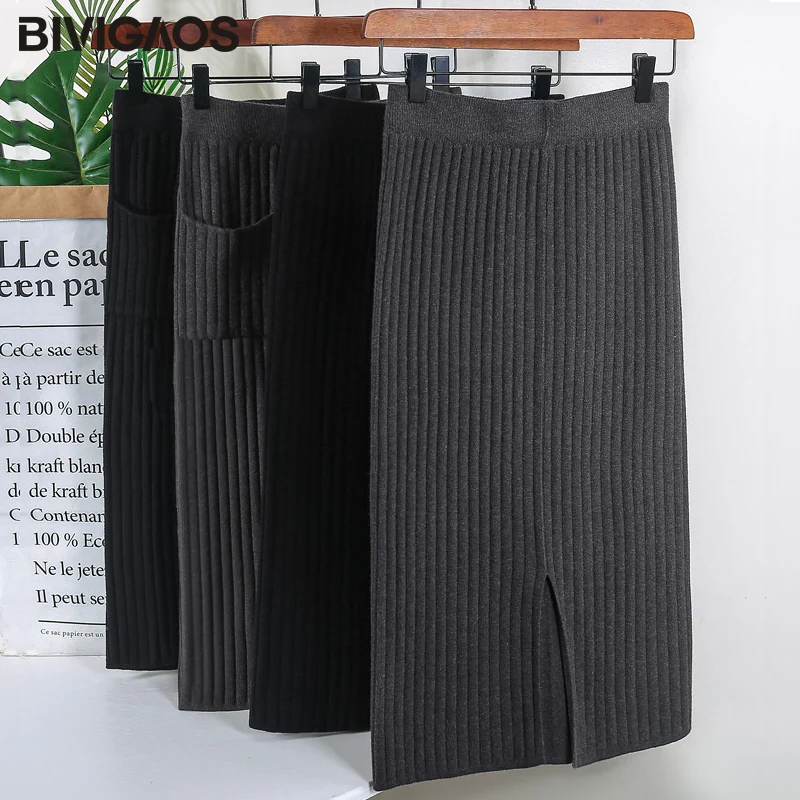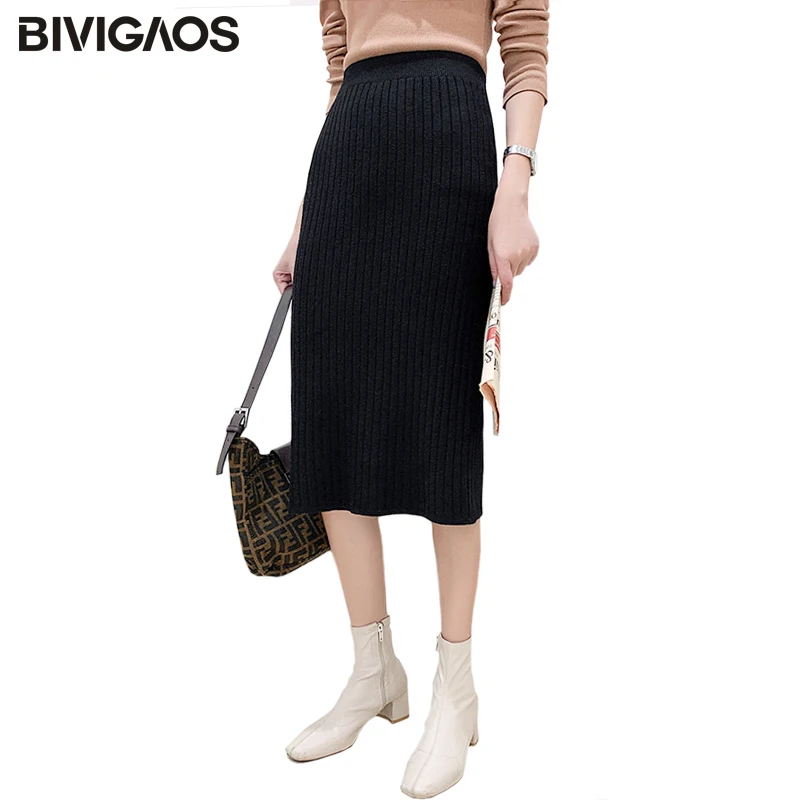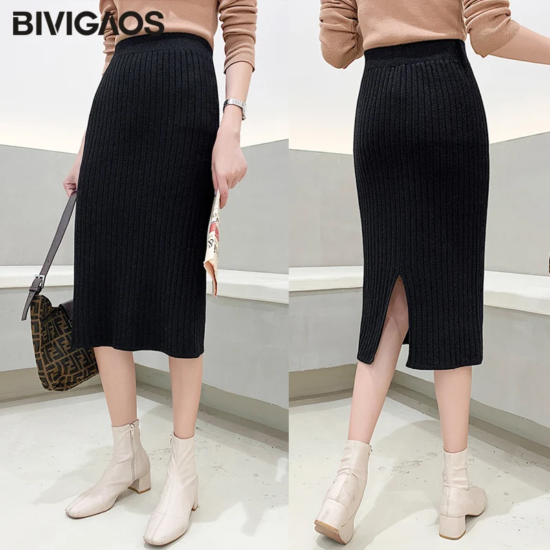 BIVIGAOS Осень-зима 2019 Новые вязаные юбки для женщин высокая талия миди тонкая юбка-карандаш модная эластичная длинная с разрезом облегающая юбка женская юбка теплая юбка зимняя юбки женские осень зима