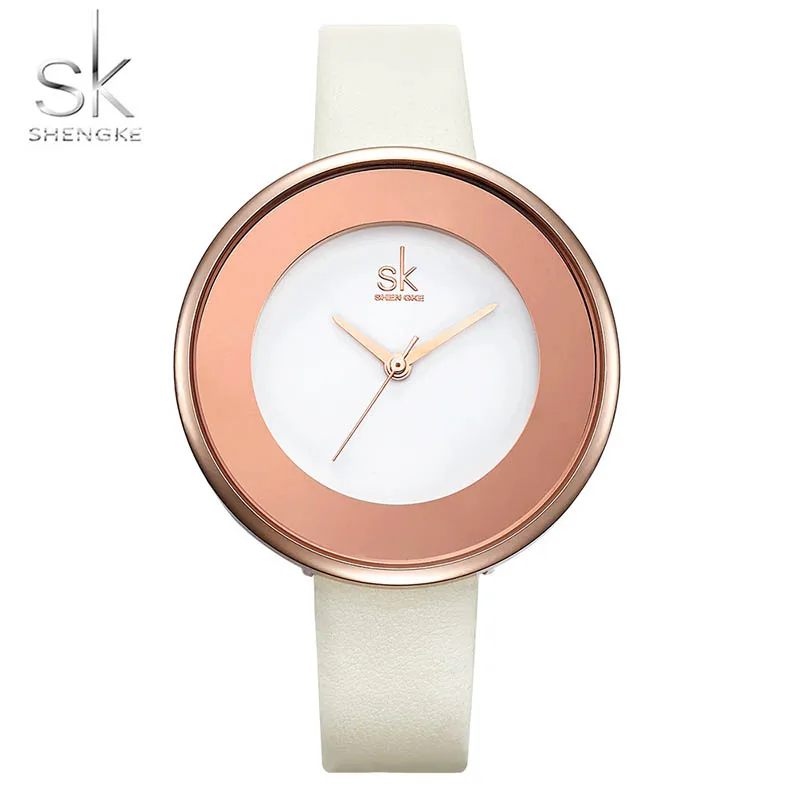 Часы наручные Shengke женские с кожаным ремешком, брендовые Роскошные Кварцевые ультратонкие, белые