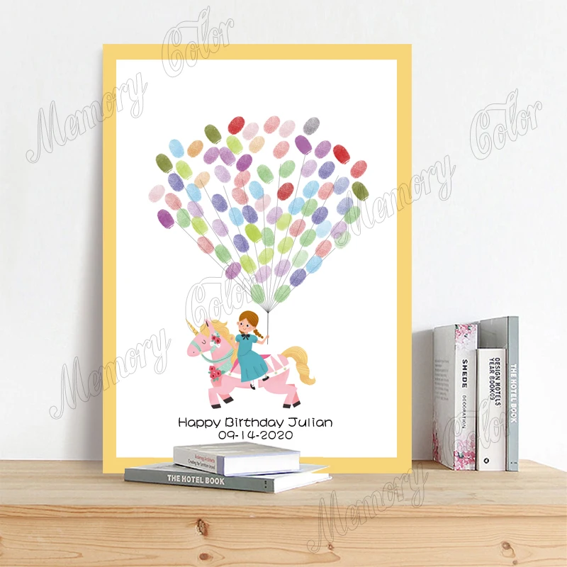 Персонализированная тема имя Дата дети и единорог отпечаток пальца DIY Гостевая книга для детского душа детский день рождения сувенир подарок
