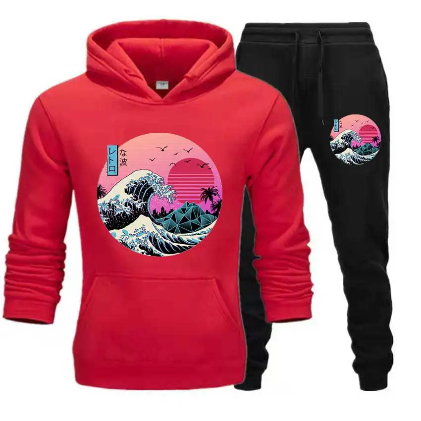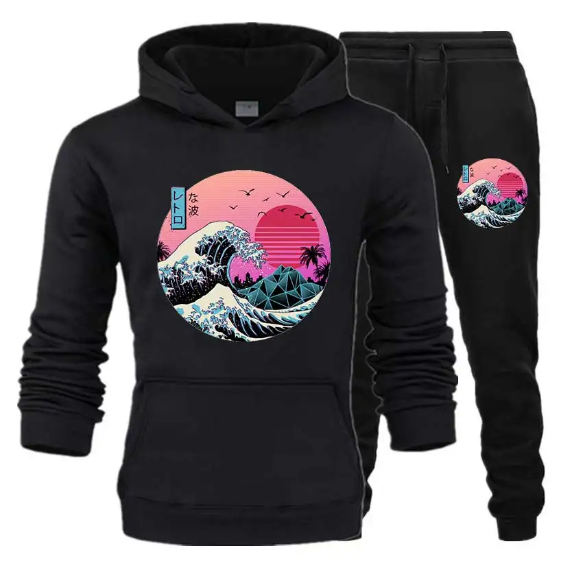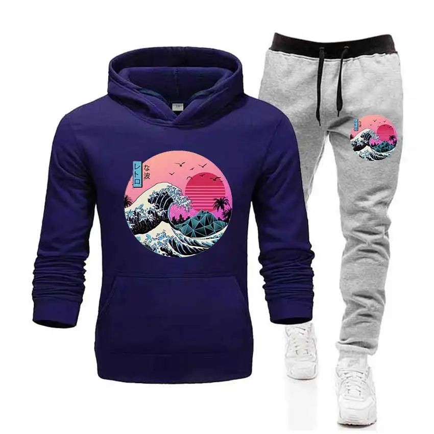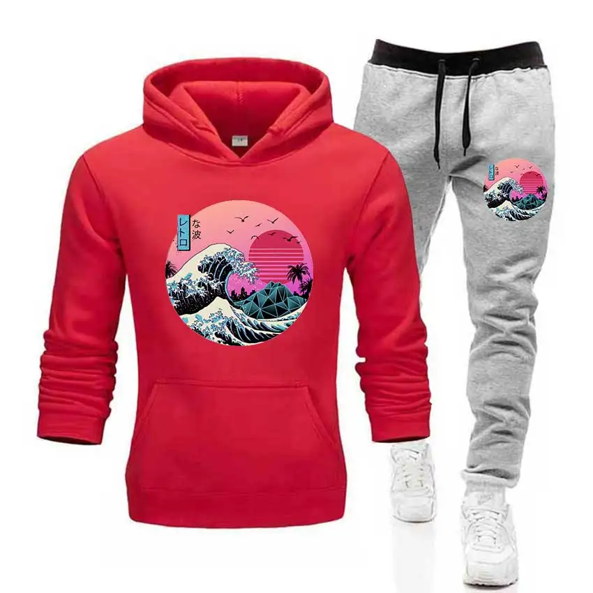 Комплект с худи в стиле ретро The Great Wave, оптовая продажа, теплые флисовые толстовки + брюки, спортивные костюмы, Прямая поставка, свитшоты, спортивный костюм, спортивная одежда