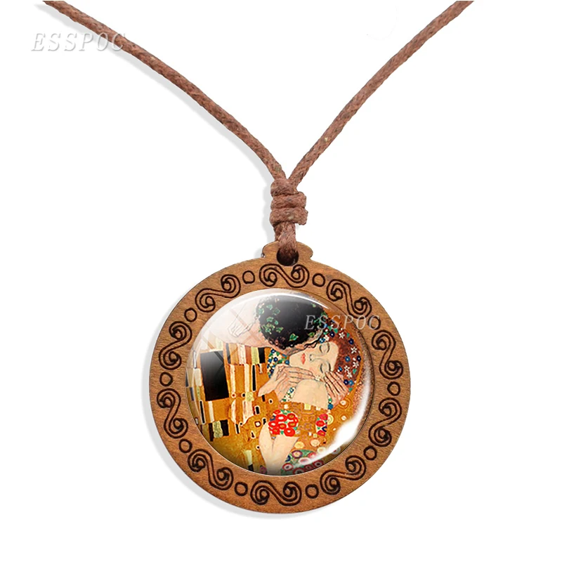 Деревянное ожерелье с поцелуем Климта, художественная роспись маслом, деревянная подвеска в стиле ретро, деревянная Вощеная цепочка, ожерелья, подарок бижутерия со стеклянными кабошонами