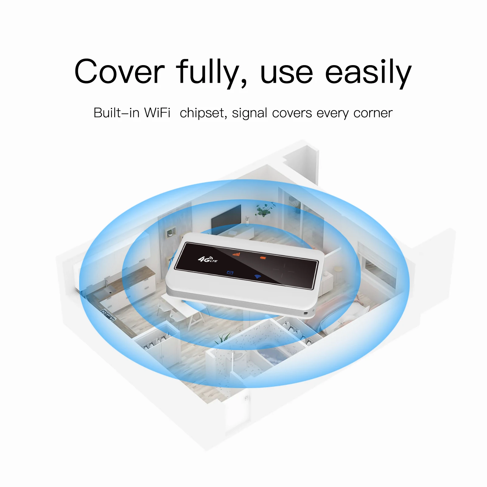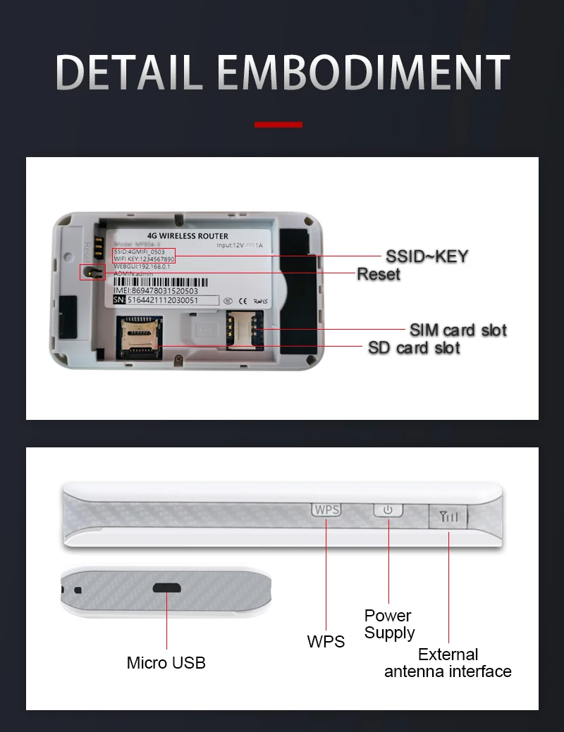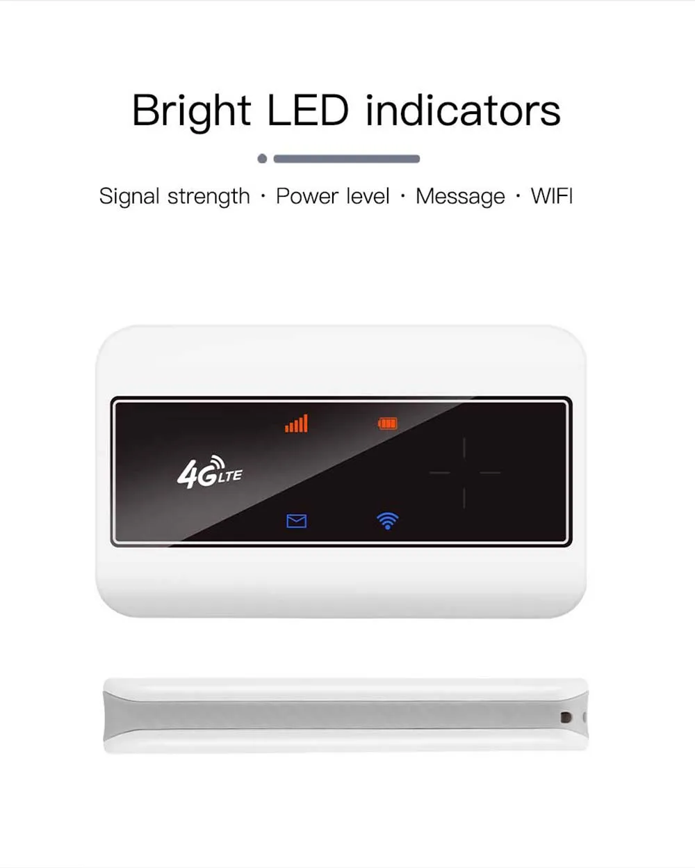 ◆ Набор микросхем MTK с поддержкой глобальной сети TDD-LTE/ FDD-LTE/ UMTS/GSM◆ LTE CAT4 до 150 Мбит/с◆ Высокая емкость 2100 мАч◆ Доступ Wi-Fi до 10 одновременно.◆ Низкое энергопотребление, батарея длится 6-8 часов,◆ Поддержка sd-карты (до 32 Гб) и обмена файлами Wi-Fi◆ 4 смарт-светодиодный индикатор◆ Порт внешней антенны CRC9◆ Стильный и портативный