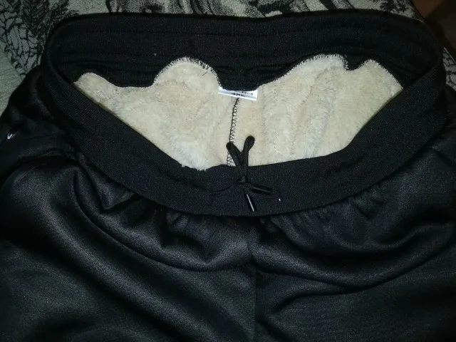Штаны изнутри на меху плотном, но коротком, тёплые, при минус 10 градусов комфортно, но слегка продуваются на сильном ветре, качественный трикотажный материал и пошив, очень удобные, в меру тянутся, но колени не растягиваются, размер подошёл отлично на мои 100кг и рост 175см. Но есть один минус, по среднему шву сзади в районе попы есть несколько затяжек по шву, несколько волокон ткани как будто вытянулись из ткани и это заметно на близком расстоянии, хотя вряд ли кто-то будет разглядывать ваш зад с расстояния полметра, на чёрной ткани в целом не заметно если не приглядеться, но сука, неприятно)) А ведь понравились и хотел заказать вторые).. Эх, а ведь штаны классные)