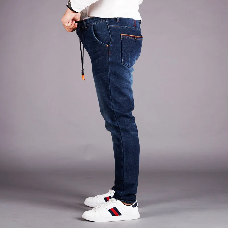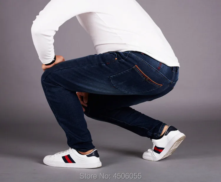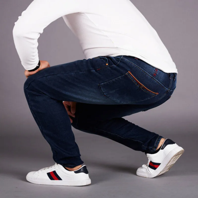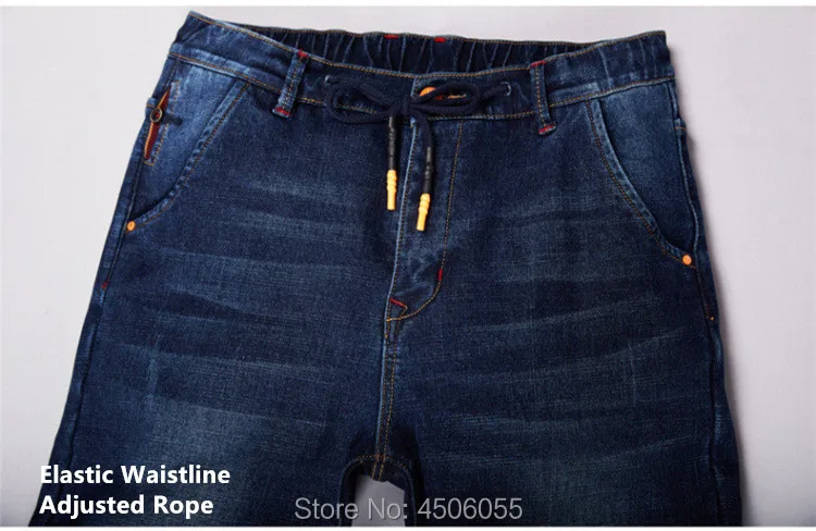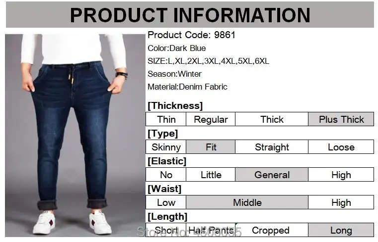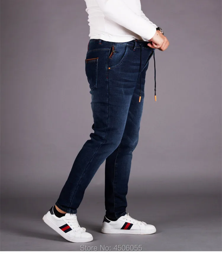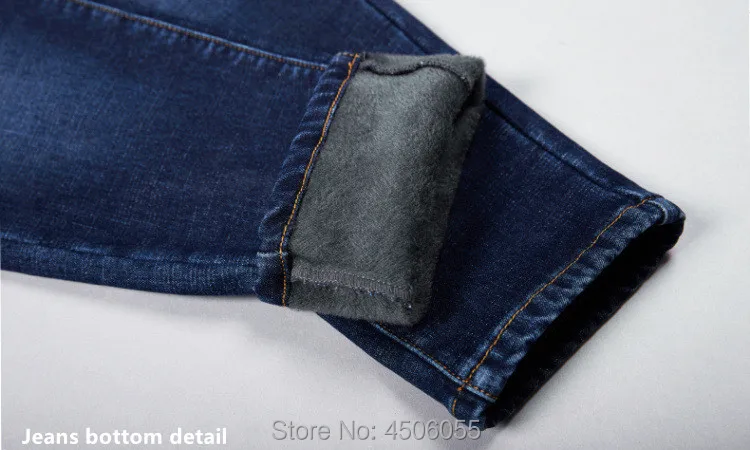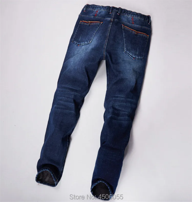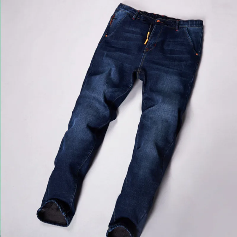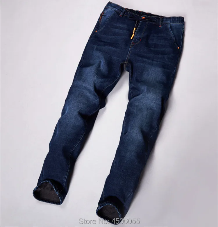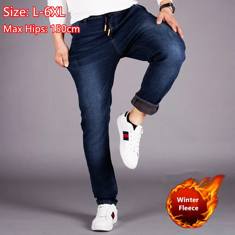 Джинсы мужские зимние с флисовой подкладкой, теплые облегающие брюки из денима, с эластичной завышенной талией, синие, размеры 5XL 6XL