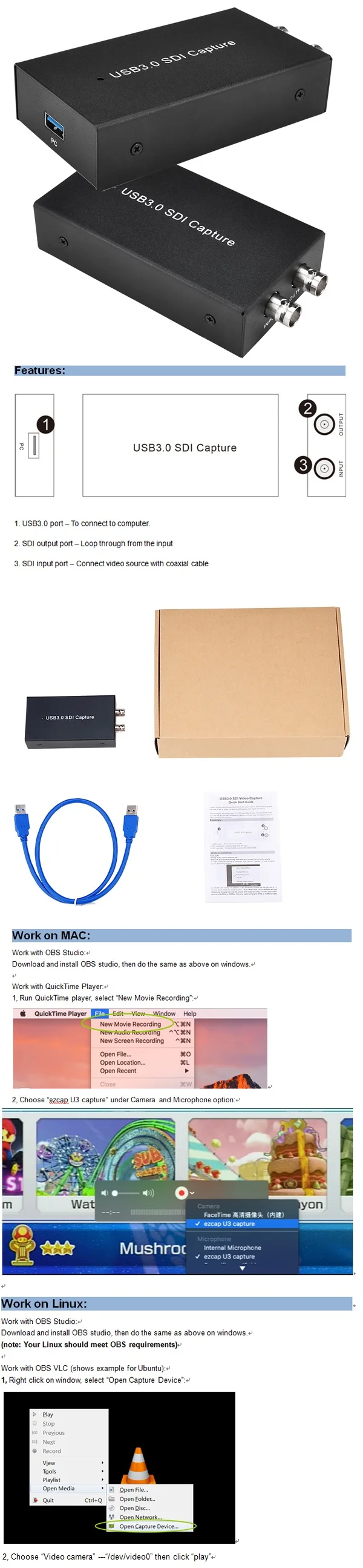 С USB3.0 SDI видеозахватом, подключи и играй-UVC интерфейсом, просто подключите к ПК (Windows, Mac, Linux), без установки драйвера, Потоковая передача и запись в 1080P 60 fpsвы можете использовать любое 3rd вечерние программное обеспечение для захвата или потоковой передачи видео HD камеры или других источников SDI HD-видео. Технические характеристики: Соединения Интерфейс: USB 3,0 Видео вход: SDI видео выход: SDI, USB3.0 Аудиовход: SDI аудиовыход: SDI, USB3.0 Дополнительные детали оборудования Размеры: 107*55*21 (мм) Вес: 80 г Посылка, содержимое 1 устройство 1xUSB3.0 кабель, 1 шт., руководство пользователя Стандартный Системные требования, Windows 7,8,10, OS X 10,9 или более поздние версии, Linux. ПК: процессор Intel Core, Процессор NVIDIA GT630, NB: Intel Core, процессор Intel, Частотный ток-2,0 ГГц, NVIDIA GT735, Mac: i5, четырехъядерный процессор или выше, vga-карта с поддержкой прямой передачи данных 10, звуковая карта 4 ГБ ОЗУ, Питание от порта USB 3,0: чипсет Intel С native USB 3,0 host controller (Renesas, Fresco...) Разрешение: 720x480 (60p), 720x576 (50p), 1280x720p (50p), 1280x720p(60p), 1920x1080 (50i), 1920x1080 (60i), 1920x1080 (24p), 1920x1080 (25p), 1920x1080 (30p), 1920x1080 (50p), 1920x1080 (60p) Совместимость с по: OBS Studio (windows,OS X); Windows Media Encoder (Windows); Firefox Media Live -Encoder (Windows, OS X); Real manufactor Plus (Windows); VLC (Windows, OS X, Linux); Вещатель QuickTime (OS X); Плеер QuickTime (OS X); Wisast (Windows, OS X); vMix(Windows); Potplayer (Windows) и т. Д. Совместимость интерфейса разработки: прямое шоу (Windows), прямое звучание (Windows),V4L2 (Linux), ALSA (Linux) OS X (QuickTime) Качество записи: макс. 1080P 60fps
