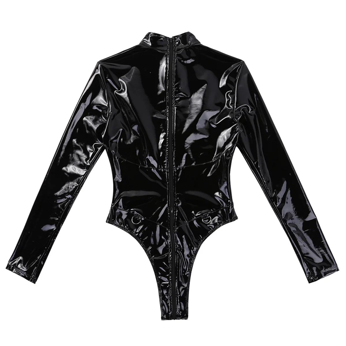 Женское нижнее белье, боди, сексуальные костюмы, Цельный купальник из лакированной кожи с высоким воротником и длинными рукавами, трико на двойной молнии, боди