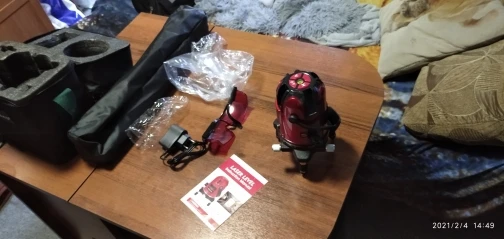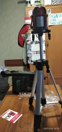 Товар пришёл быстро,до Калуги.цена качество соответствуют.уровень на приборе и на штативе показывает не точно(это мелочи)).всё остальное работает хорошо,линии чёткие (в помещении 5*5).питание от пальчиковых батареек (в комплект не входят) и от блока питания (шнур короткий).в целом покупкой (товаром)доволен.продавца рекомендую!