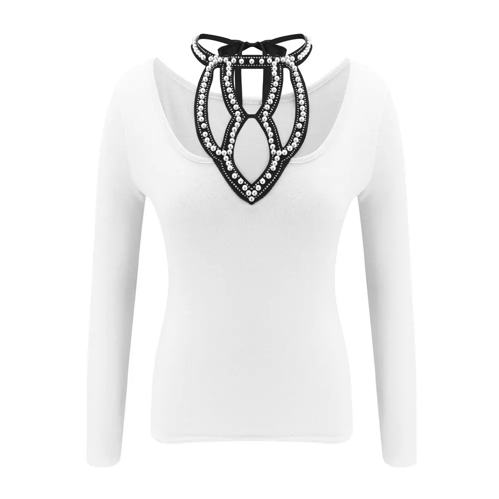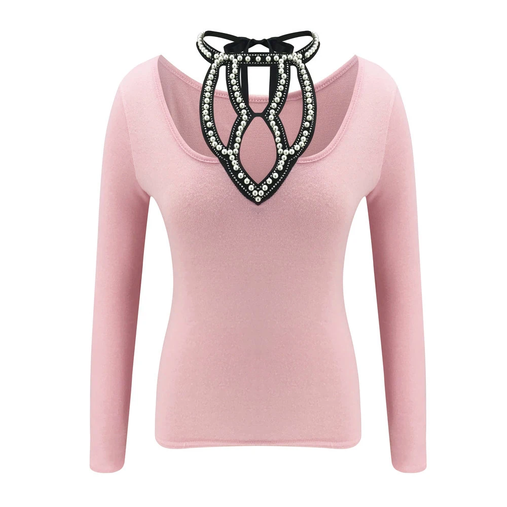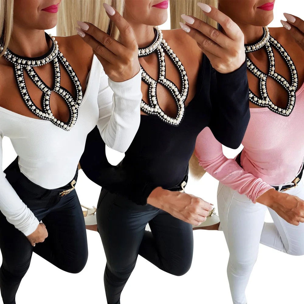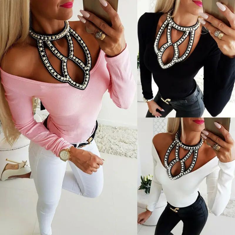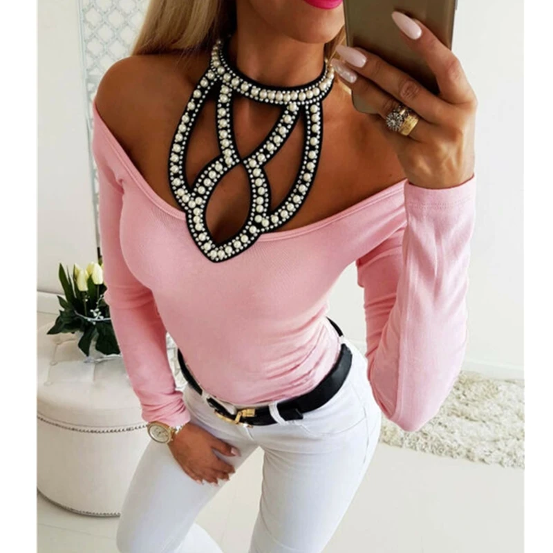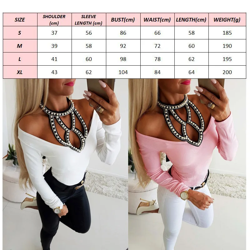 Женская футболка HIRIGIN с открытыми плечами и длинными рукавами, Сексуальные облегающие топы с вырезами, футболка с вышивкой бисером, трико с вырезами