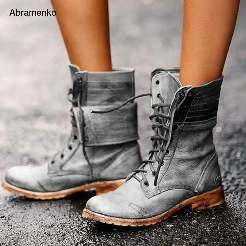 Женские кожаные сапоги до колена, на шнуровке, на плоской подошве, винтажный стиль, большие размеры 35-43