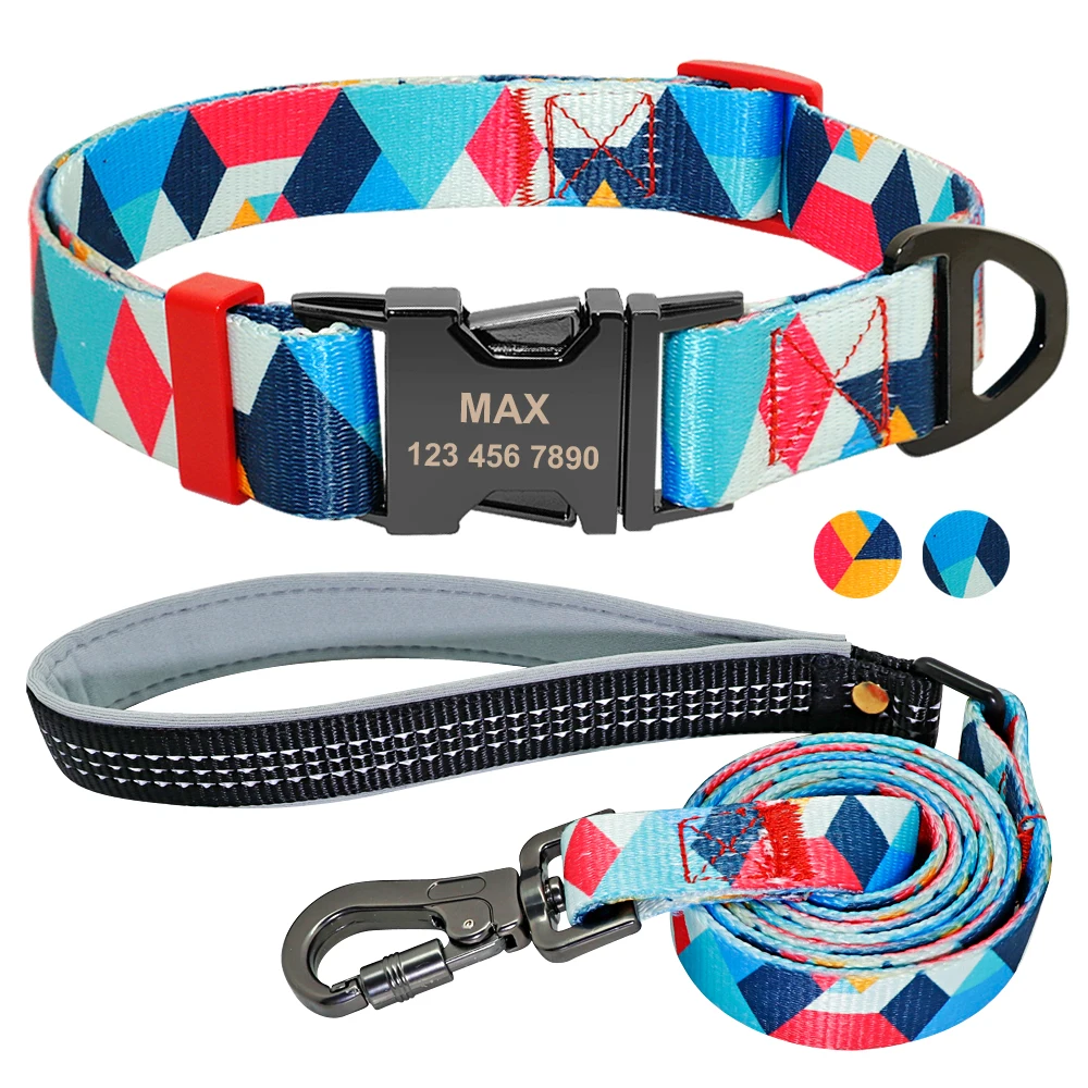 Персонализированный собачий ошейник и поводок, клетчатые нейлоновые ошейники для питомцев с выгравированной табличкой, биркой, прогулочный поводок для маленьких и больших собак