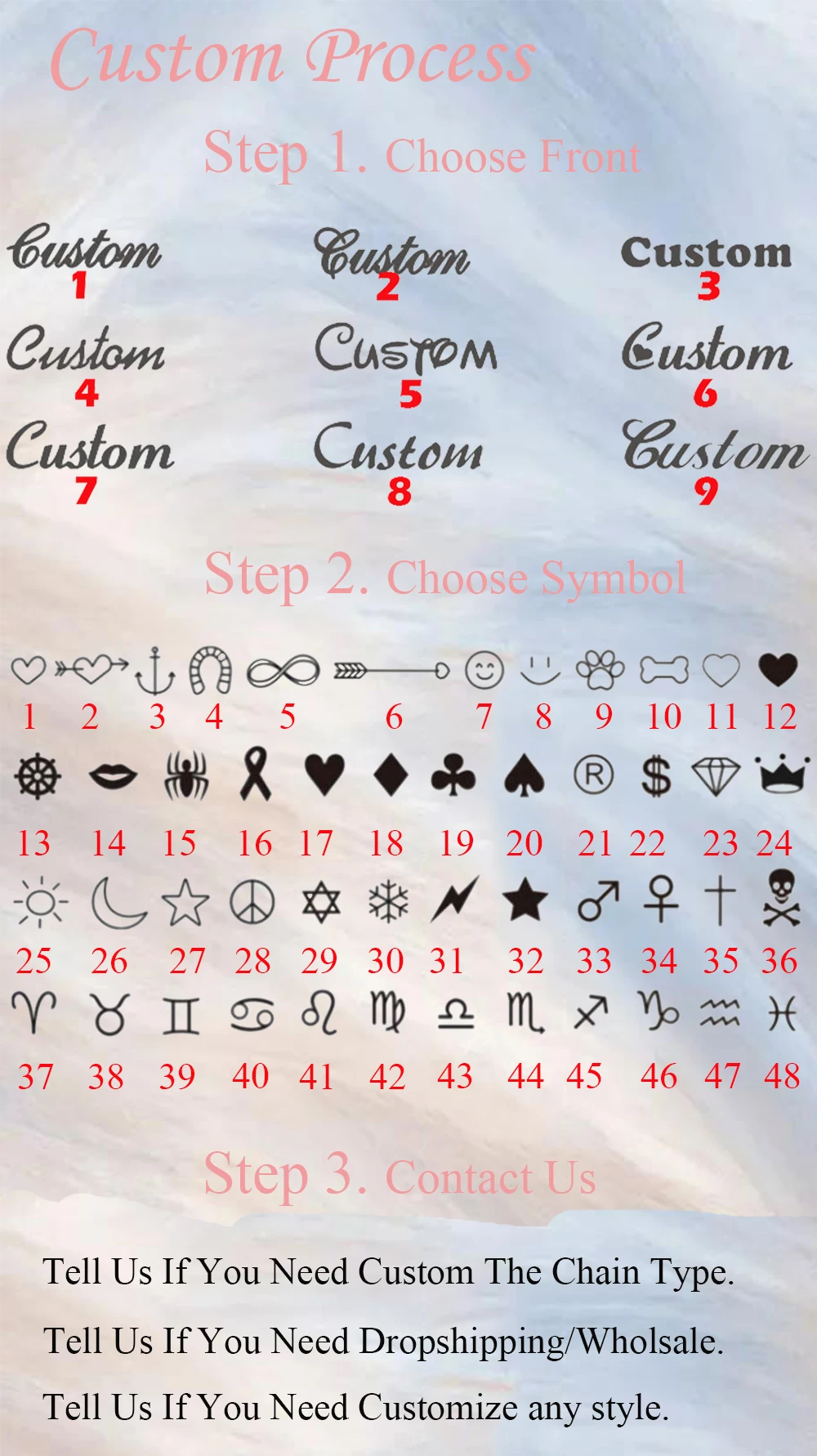 Внимание: друг, после размещения заказа. Пожалуйста, пришлите нам имя, которое вы хотите настроить. И выберите тип шрифта, который вам нравится. (Например: Анна, шрифт 3.)