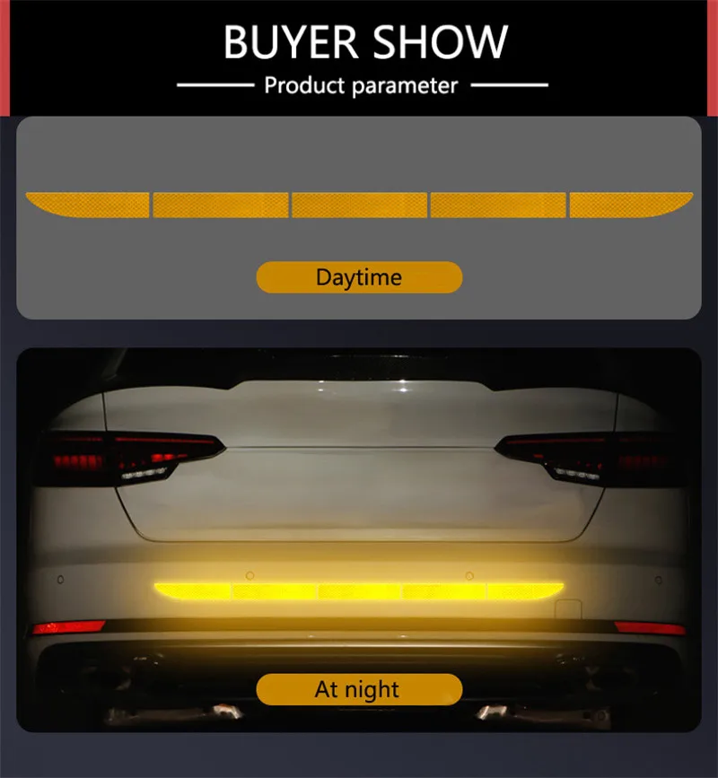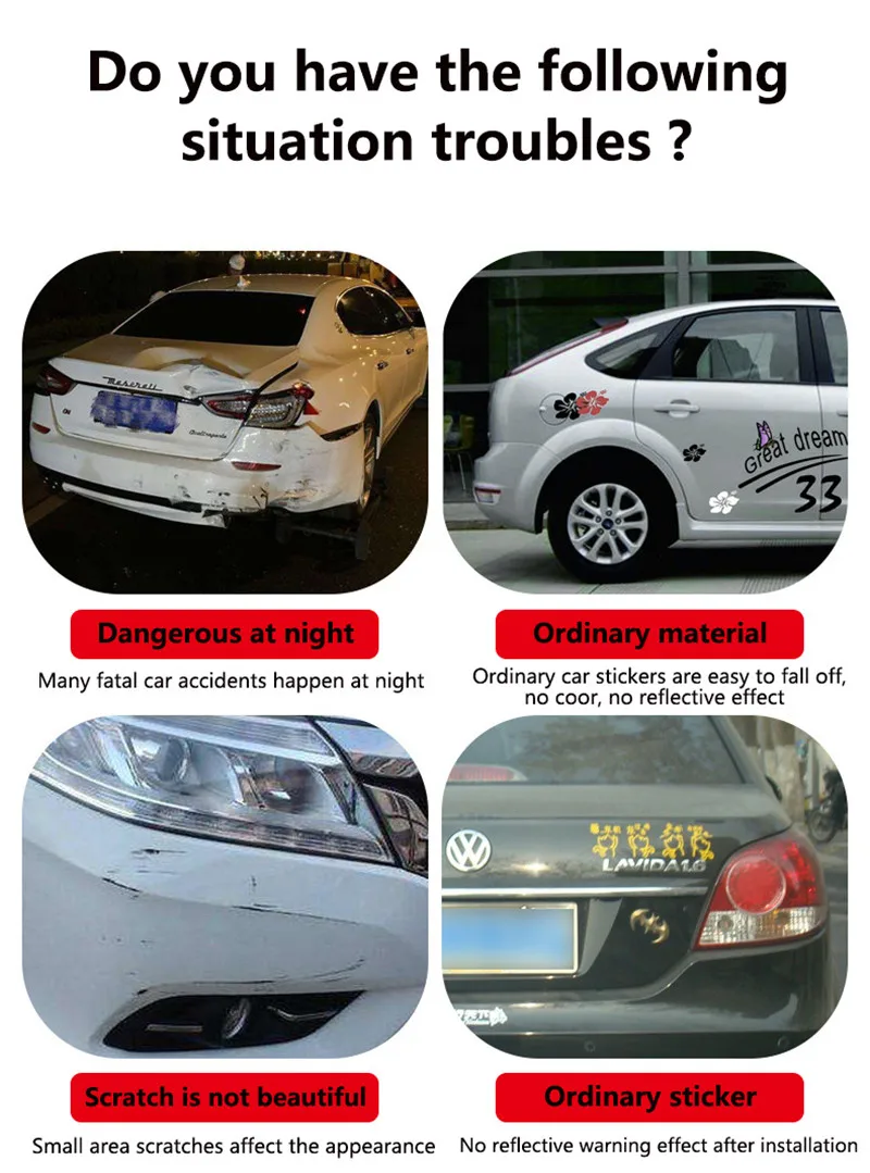 1. Нано мастерство, бесследная клейкая наклейка,2. Сильное отражение, большое расстояние отражения, почти 300 м,3. Водонепроницаемость, защита от солнца и дождя, высокая прочность и длительный срок службы,4. Уменьшает вероятность случайного столкновения,5. Улучшить визуальность транспортного средства, что делает вас ездить безопаснее,