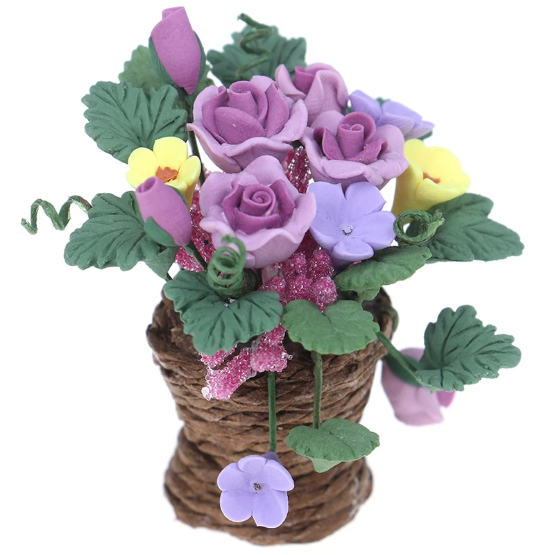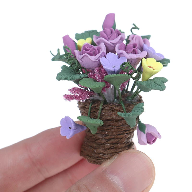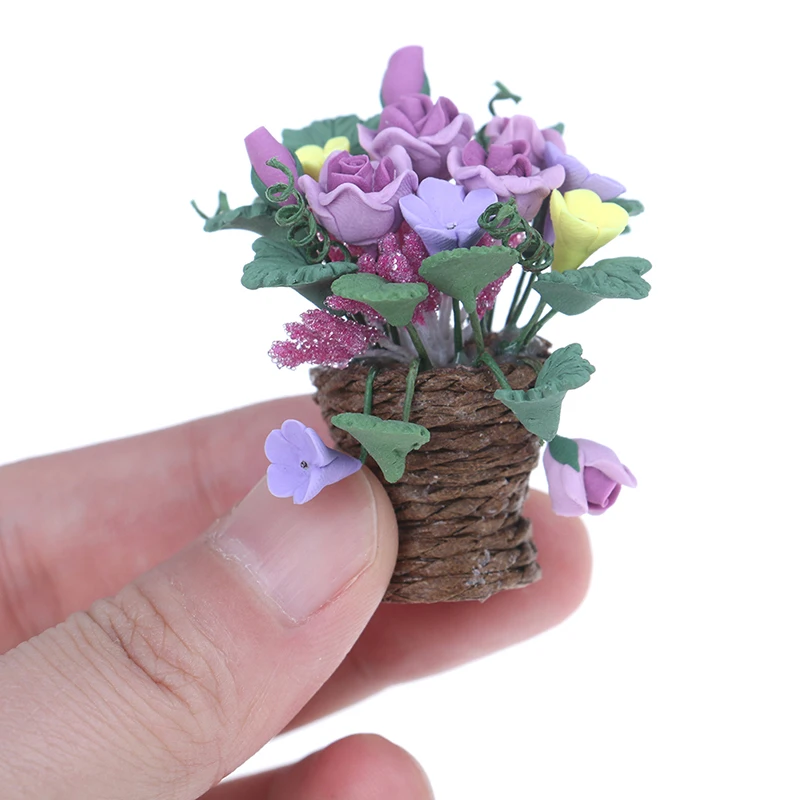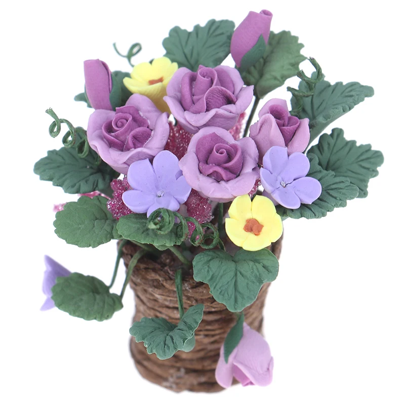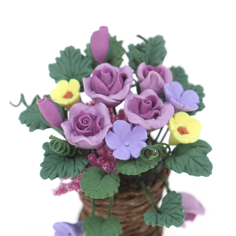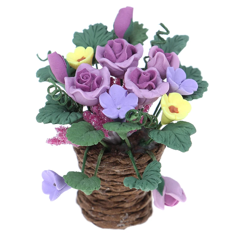 Миниатюрные глиняные цветы для кукольного домика, ротанговый горшок, сказочный садовый аксессуар для растений, масштаб 1:12, фиолетовый цветок