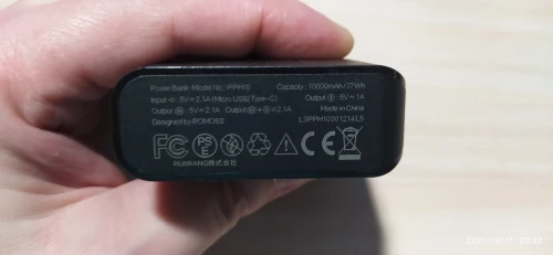 ПРОДАВЕЦ ОТЛИЧНЫЙ. Шло до Хабаровска из Китая месяц, в России- DPD до пункта выдачи. Простая банка без особых опций. Честно впитал почти 10000 мА/ч, отдал 7000 мА/ч - здесь все в норме, но заряжает медленно скорость max 1.7А/ч (взял провод и ЗУ хорошего качества). Индикатор заряда примитивный 4 точки и не очень корректный. Все гнезда рабочие, один порт USB дает 2А, но ошибка в графике - порт USB с изображением двух "молний" должен дать 2А, а порт с одной "молнией"- 1А, у меня же наоборот, что может говорить о полукустарном производстве, а может безобидная ошибка. Данный ВнАк позиционируется как компактный, но чуда не произошло, если вы подумали, что здесь используется супер Li-ion аккумы и это позволило создать мини пауэр-банк, то ошибаетесь, в реальности физический объем корпуса и вес этой Банки ни чем не отличается от других "10-тысячников". Размеры данной банки 92х63х24мм= 140см³ и вес 200гр, к примеру ROCK M01-134х68х16мм=145см³ и 220гр, плюс есть цифровой индикатор и цена схожая.
