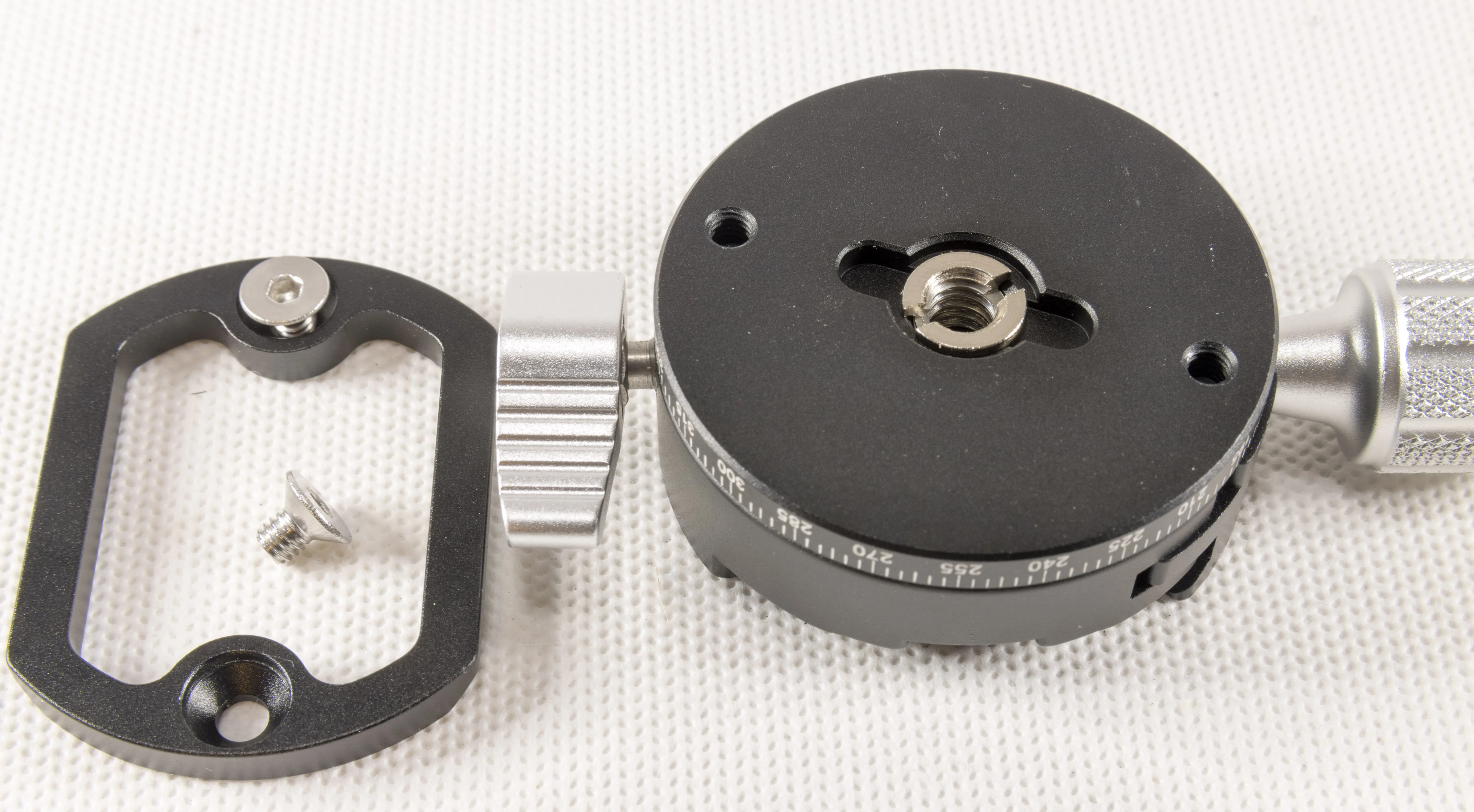 Фиксация вращения острым винтом возле оси по малому радиусу. От винта остаются вмятинки, ни о каком проскальзывании с лёгким усилием и речи не идёт - цепляется за края предыдущих вмятинок. В общем не самый качественный ротатор. Крутится по масляной плёнке плавно и вязко, тут никаких претензий. Если просто ставить нужный угол и зажимать и нагрузку небольшую, то работает отлично.